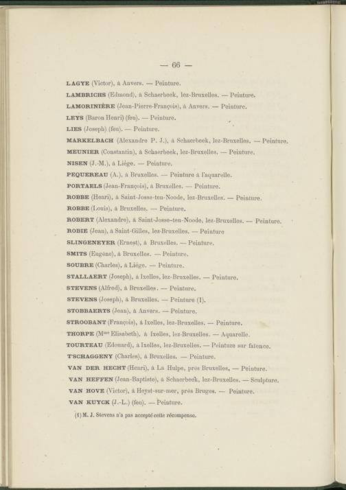 ROBERT (Alexandre), à Saint-Josse-ten-Noode, lez-Bruxelles. — Peinture. ROBIE (.Jean), à Saint-Gilles, lez-Bruxelles. — Peinture SLINGENEYER (Ernest), à Bruxelles. — Peinture.