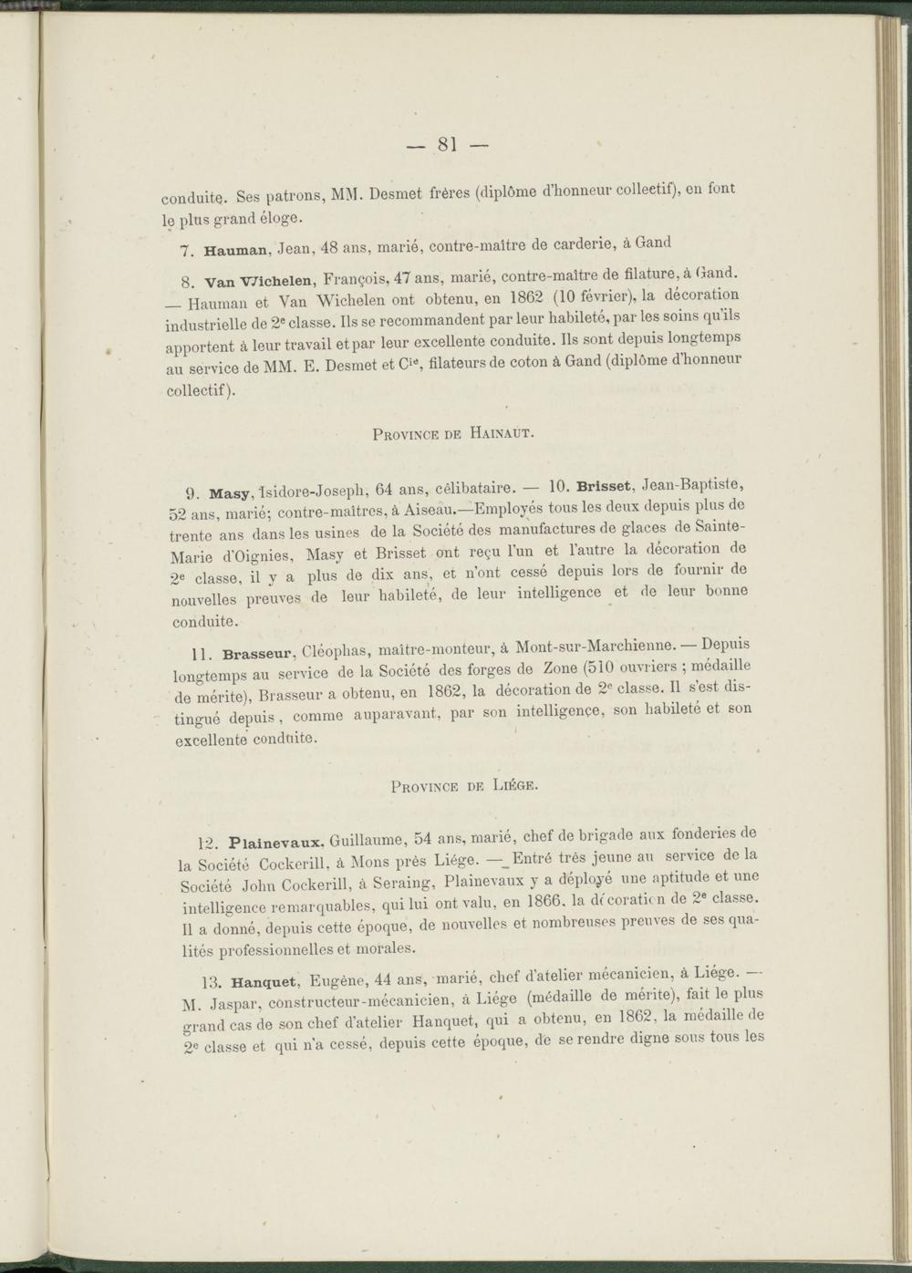 9. Masy, 'Isidore-Joseph, 64 ans, célibataire. — 10. Brisset, Jean-Baptiste, 52 ans, marié; contre-maîtres, à Aiseau.—Employés tous les deux depuis plus de trente ans dans les usines de la Société des manufactures de glaces de Sainte- Marie d’Oignies, Masy et Brisset ont reçu l’un et l’autre la décoration de 2 e classe, il y a plus de dix ans, et n’ont cessé depuis lors de fournir de nouvelles preuves de leur habileté, de leur intelligence et de leur bonne conduite.