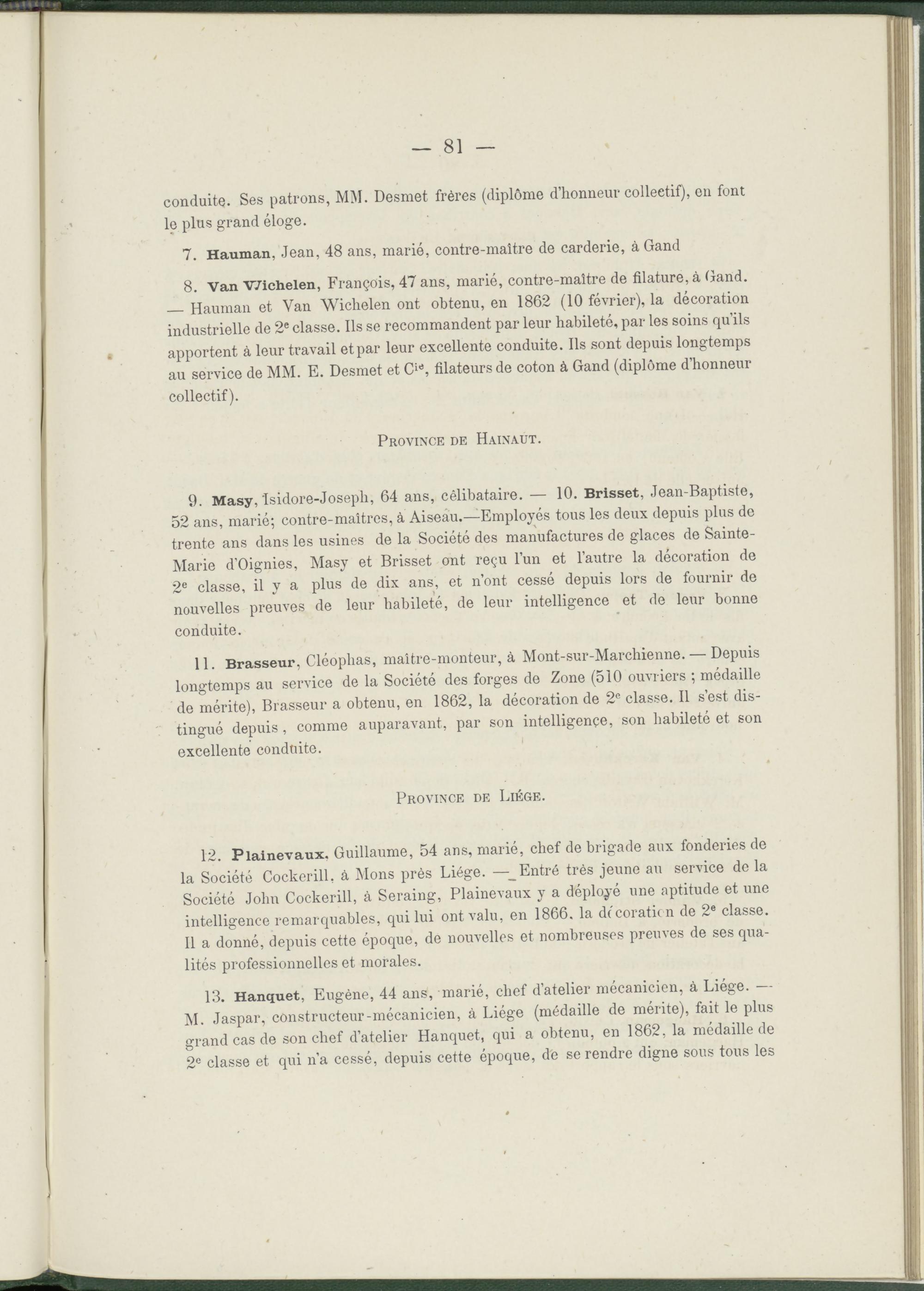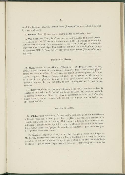 13. Hanquet, Eugène, 44 ans, marié, chef d’atelier mécanicien, à Liège. — M. Jaspar, constructeur-mécanicien, à Liège (médaille de mérite), fait le plus grand cas de son chef d’atelier Hanquet, qui a obtenu, en 1862, la médaille de 2° classe et qui n’a cessé, depuis cette époque, de se rendre digne sous tous les
