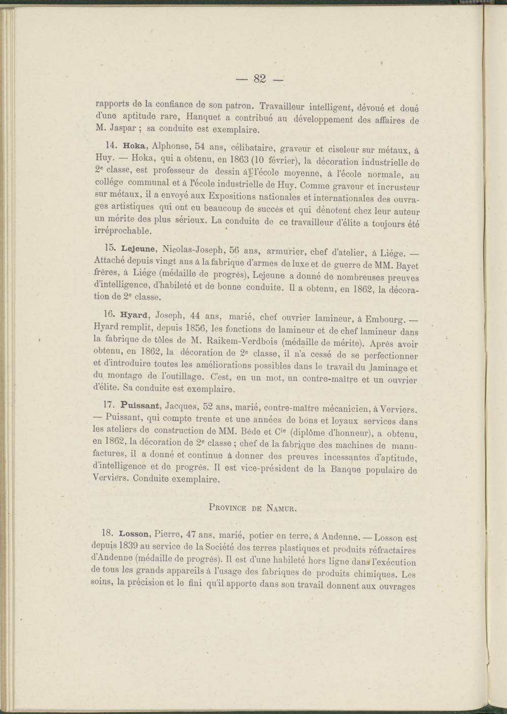 17. Puissant, Jacques, 52 ans, marié, contre-maître mécanicien, àVerviers. — Puissant, qui compte trente et une années de bons et loyaux services dans les ateliers de construction de MM. Bède et C ie (diplôme d’honneur), a obtenu, en 1862, la décoration de 2 e classe ; chef de la fabrique des machines de manufactures, il a donné et continue à donner des preuves incessantes d’aptitude, d’intelligence et de progrès. Il est vice-président de la Banque populaire de Vervièrs. Conduite exemplaire.