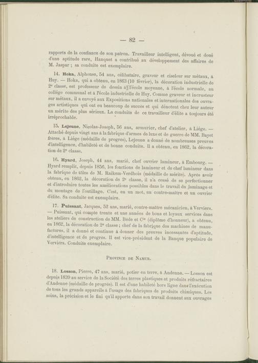16. Hyard, Joseph, 44 ans, marié, chef ouvrier lamineur, à Embourg. — Hyard remplit, depuis 1856, les fonctions de lamineur et de chef lamineur dans la fabrique de tôles de M. Raikem-Verdbois (médaille de mérite). Après avoir obtenu, en 1862, la décoration de 2 e classe, il n’a cessé de se perfectionner et d’introduire toutes les améliorations possibles dans le travail du laminage et du montage de l’outillage. C’est, en un mot, un contre-maître et un ouvrier d’élite. Sa conduite est exemplaire.