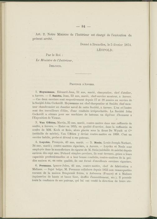 4. Luyckx, François, 43 ans, marié. — 5. Neels, Louis-Joseph-Norbert, 34 ans, marié ; contre-maîtres cigariers, à Anvers. — Luyckx et Neels sont employés dans la manufacture de cigares de M. Stein (médaille de mérite) depuis environ dix-sept ans. D’abord simples guvriers, ils sont devenus, grâce à leurs capacités professionnelles et à leur bonne conduite, contre-maîtres de la prédite maison et, en cette qualité, ils ont formé d’excellents ouvriers cigariers.