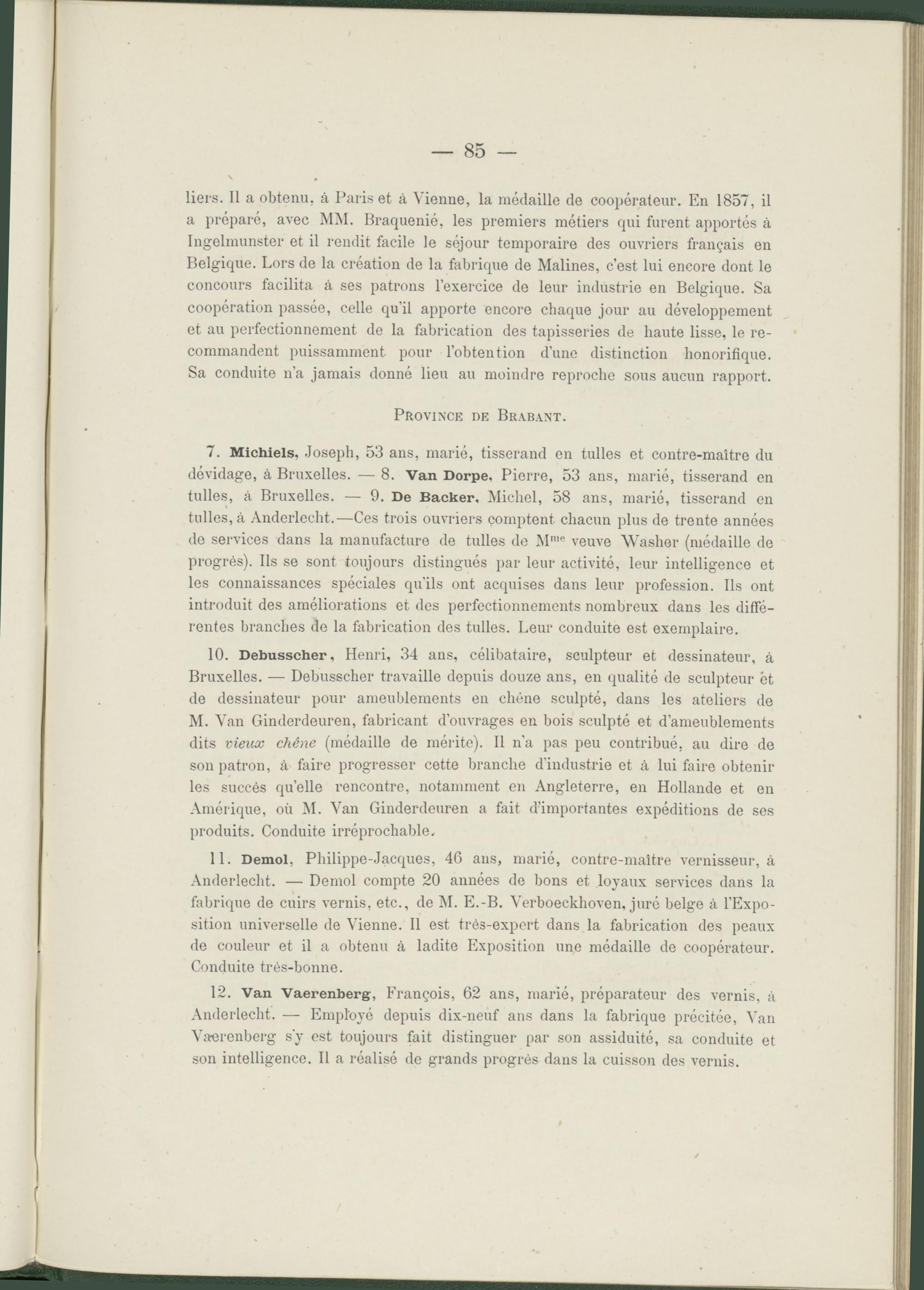 11. Demol, Philippe-Jacques, 46 ans, marié, contre-maître vernisseur, à Anderlecht. — Demol compte 20 années de bons et loyaux services dans la fabrique de cuirs vernis, etc., de M. E.-B. Verboeckhoven, juré belge à l’Exposition universelle de Vienne. Il est très-expert dans la fabrication des peaux de couleur et il a obtenu à ladite Exposition une médaille de coopérateur. Conduite très-bonne.