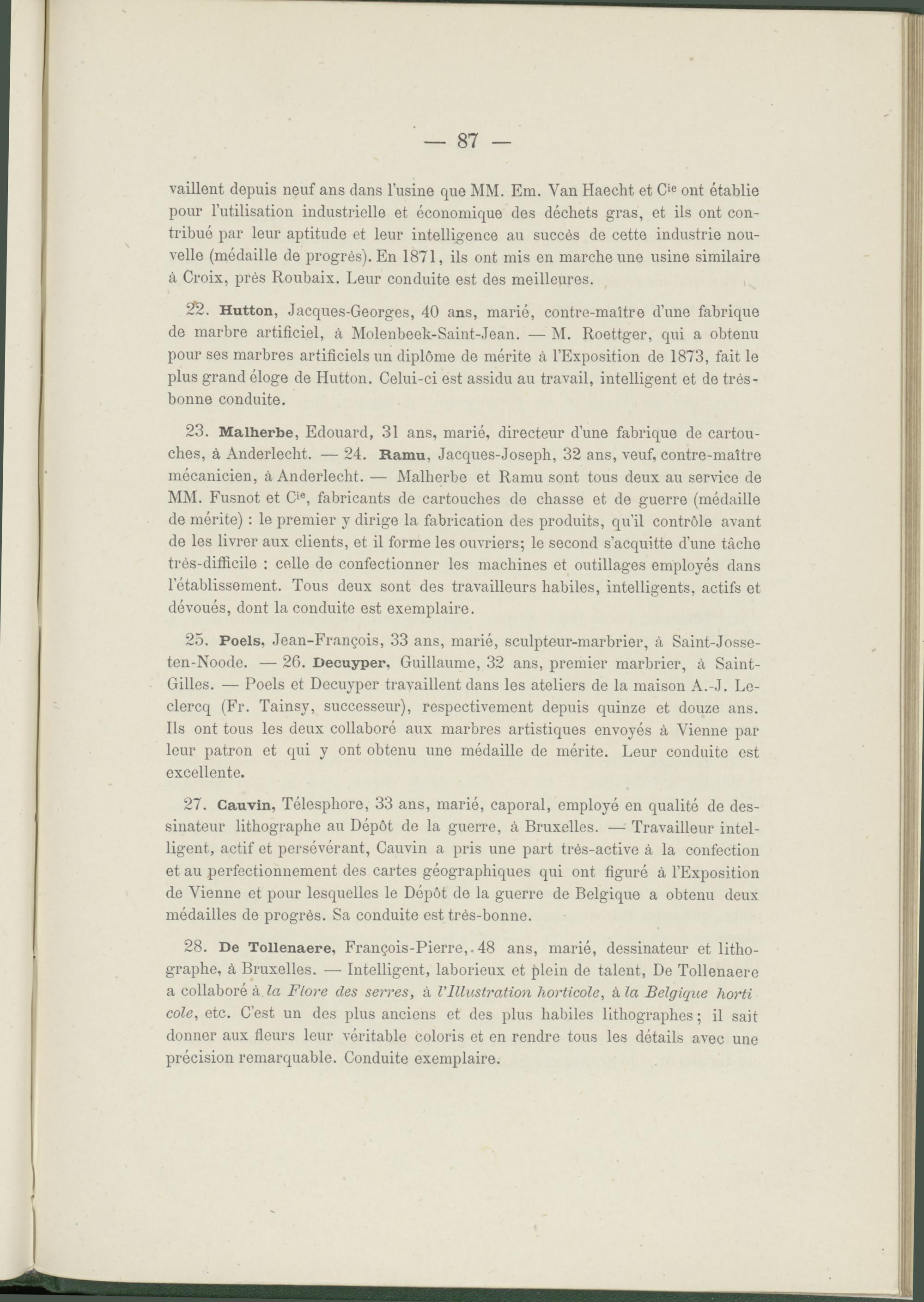 22. Hutton, Jacques-Georges, 40 ans, marié, contre-maître d’une fabrique de marbre artificiel, à Molenbeek-Saint-Jean. ■— M. Roettger, qui a obtenu pour ses marbres artificiels un diplôme de mérite à l’Exposition de 1873, fait le plus grand éloge de Hutton. Celui-ci est assidu au travail, intelligent et de très- bonne conduite.