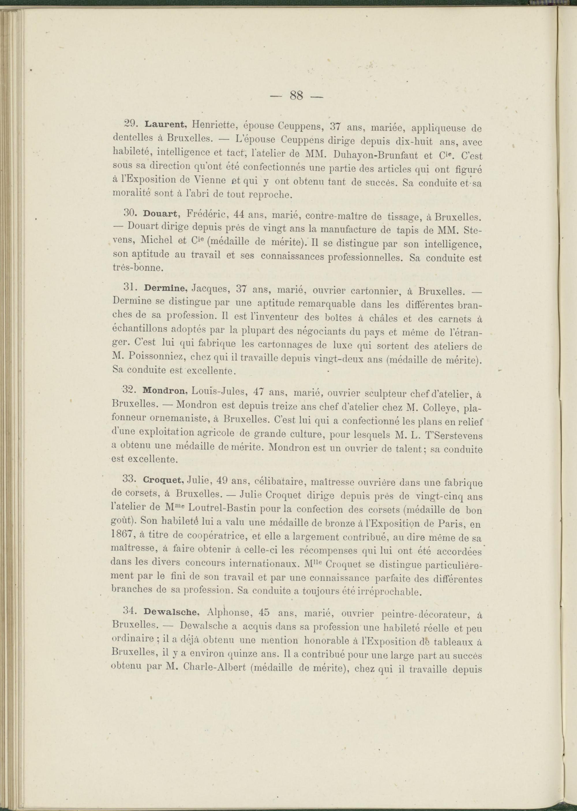 31. Dermine, Jacques, 37 ans, marié, ouvrier cartonnier, à Bruxelles. — Dermine se distingue par une aptitude remarquable dans les différentes branches de sa profession. Il est l’inventeur des boîtes à châles et des carnets à échantillons adoptés par la plupart des négociants du pays et même de l’étranger. C’est lui qui fabrique les cartonnages de luxe qui sortent des ateliers de M. Poissonniez, chez qui il travaille depuis vingt-deux ans (médaille de mérite). Sa conduite est excellente.