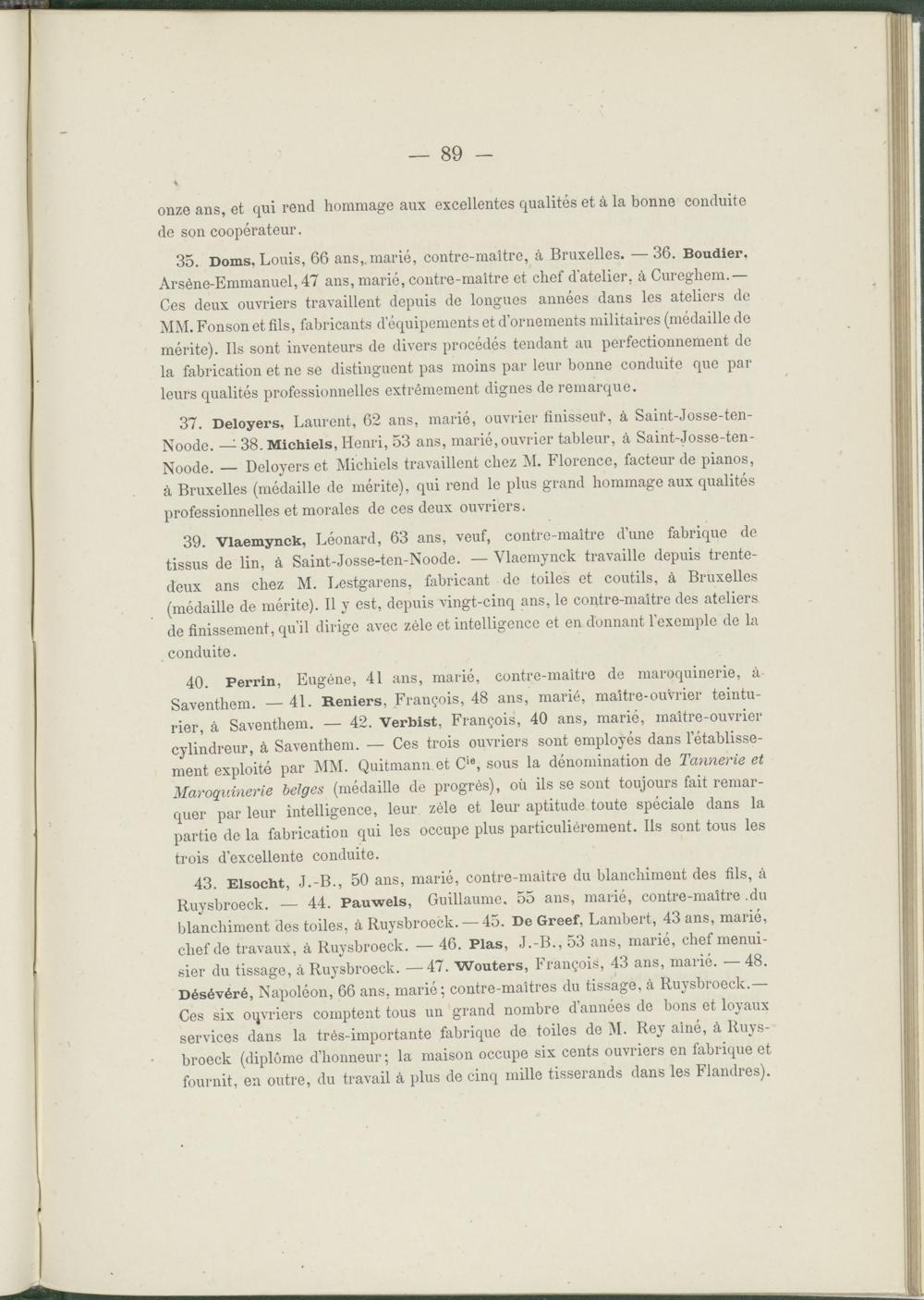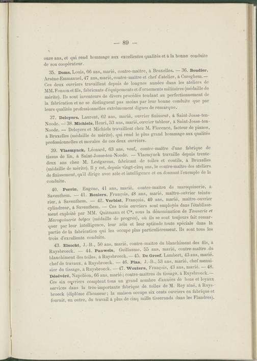 35. Doms, Louis, 66 ans,, marié, contre-maître, à Bruxelles. —36. Boudier, Arsène-Emmanuel, 47 ans, marié, contre-maître et chef d'atelier, à Cureghem.— Ces deux ouvriers travaillent depuis de longues années dans les ateliers de MM. Fonsonet fils, fabricants d’équipements et d’ornements militaires (médaille de mérite). Ils sont inventeurs de divers procédés tendant au perfectionnement de la fabrication et ne se distinguent pas moins par leur bonne conduite que par leurs qualités professionnelles extrêmement dignes de remarque.
