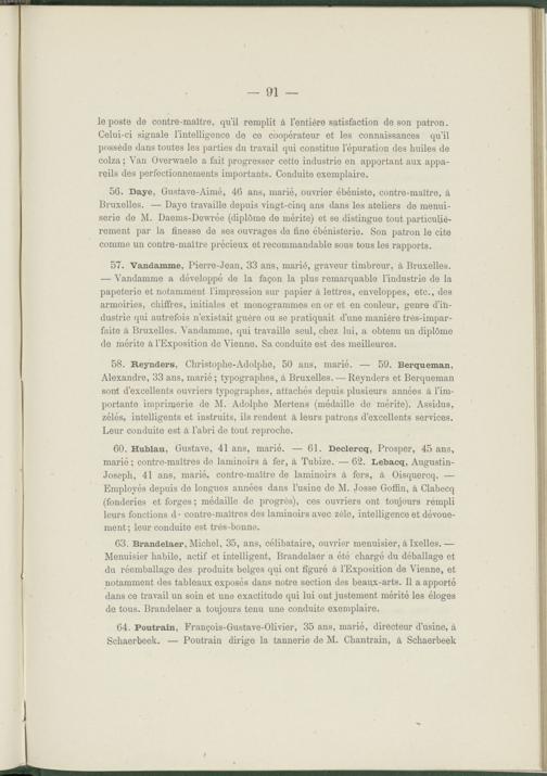 63. Brandelaer, Michel, 35, ans, célibataire, ouvrier menuisier, à Ixelles. — Menuisier habile, actif et intelligent, Brandelaer a été chargé du déballage et du réemballage des produits belges qui ont figuré à l’Exposition de Vienne, et notamment des tableaux exposés dans notre section des beaux-arts. Il a apporté dans ce travail un soin et une exactitude qui lui ont justement mérité les éloges de tous. Brandelaer a toujours tenu une conduite exemplaire.