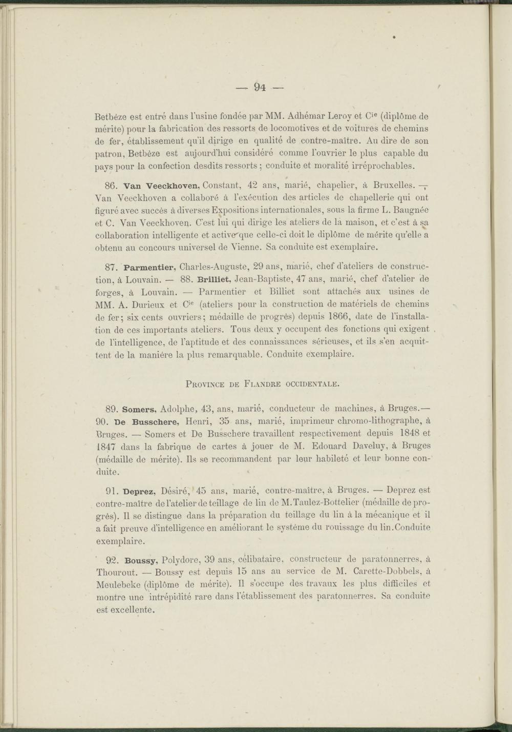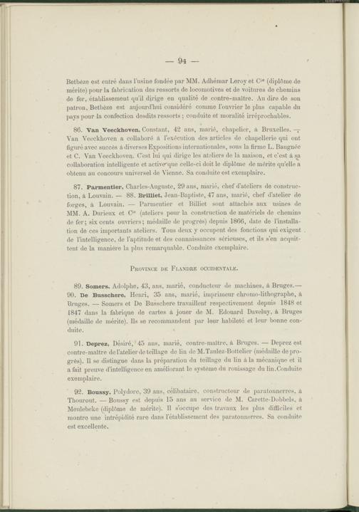 87. Parmentier, Charles-Auguste, 29 ans, marié, chef d’ateliers de construction, à Louvain. — 88. Brilliet, Jean-Baptiste, 47 ans, marié, chef d’atelier de forges, à Louvain. — Parmentier et Billiet sont attachés aux usines de MM. A. Durieux et C ie (ateliers pour la construction de matériels de chemins do fer; six cents ouvriers; médaille de progrès) depuis 1866, date de l’installation de ces importants ateliers. Tous deux y occupent des fonctions qui exigent de l’intelligence, de l’aptitude et des connaissances sérieuses, et ils s’en acquittent de la manière la plus remarquable. Conduite exemplaire.