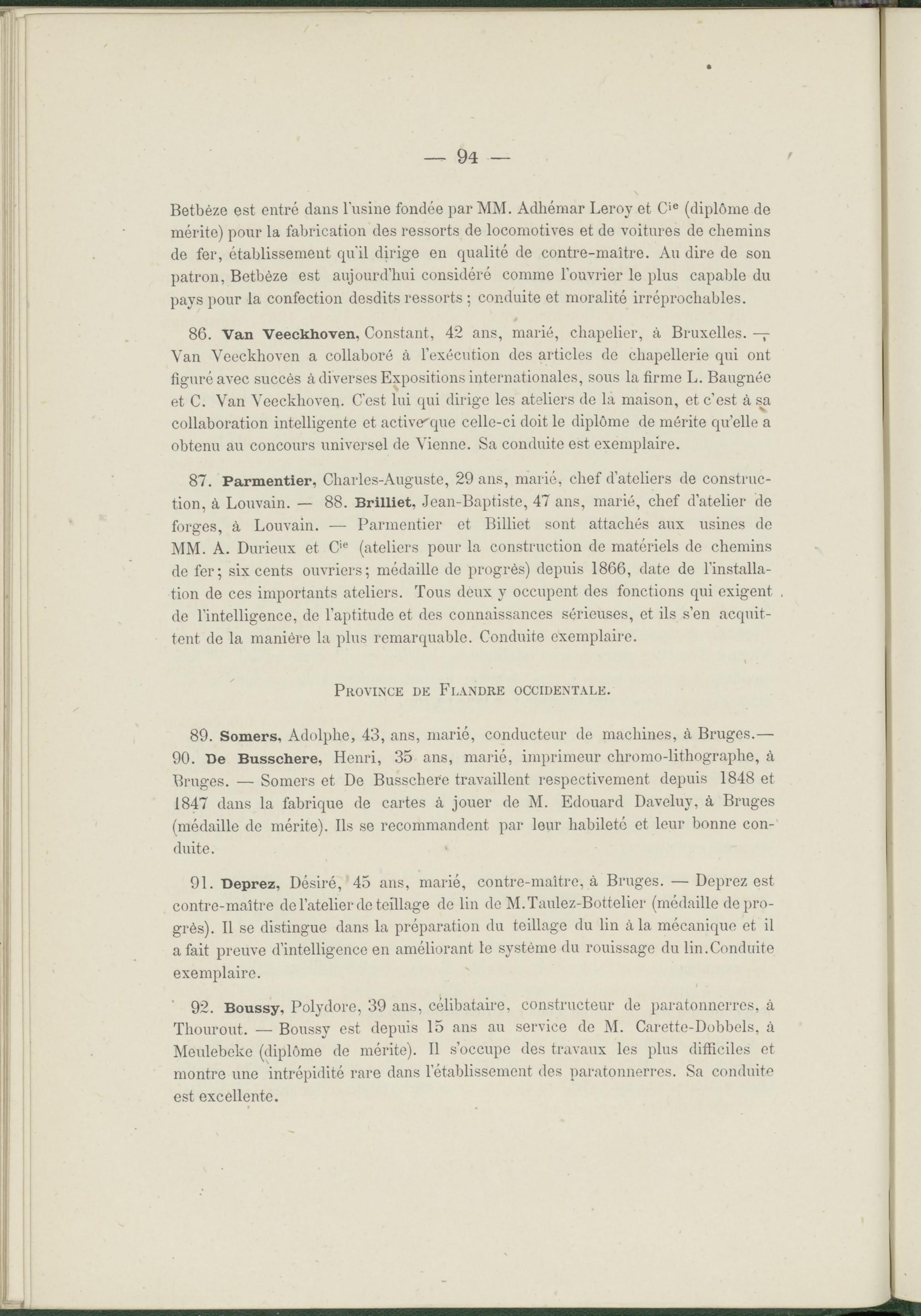92. Boussy, Polydore, 39 ans, célibataire, constructeur de paratonnerres, à Thourout. — Boussy est depuis 15 ans au service de M. Carette-Dobbels, à Meulebeke (diplôme de mérite). Il s’occupe des travaux les plus difficiles et montre une intrépidité rare dans l’établissement des paratonnerres. Sa conduite est excellente.
