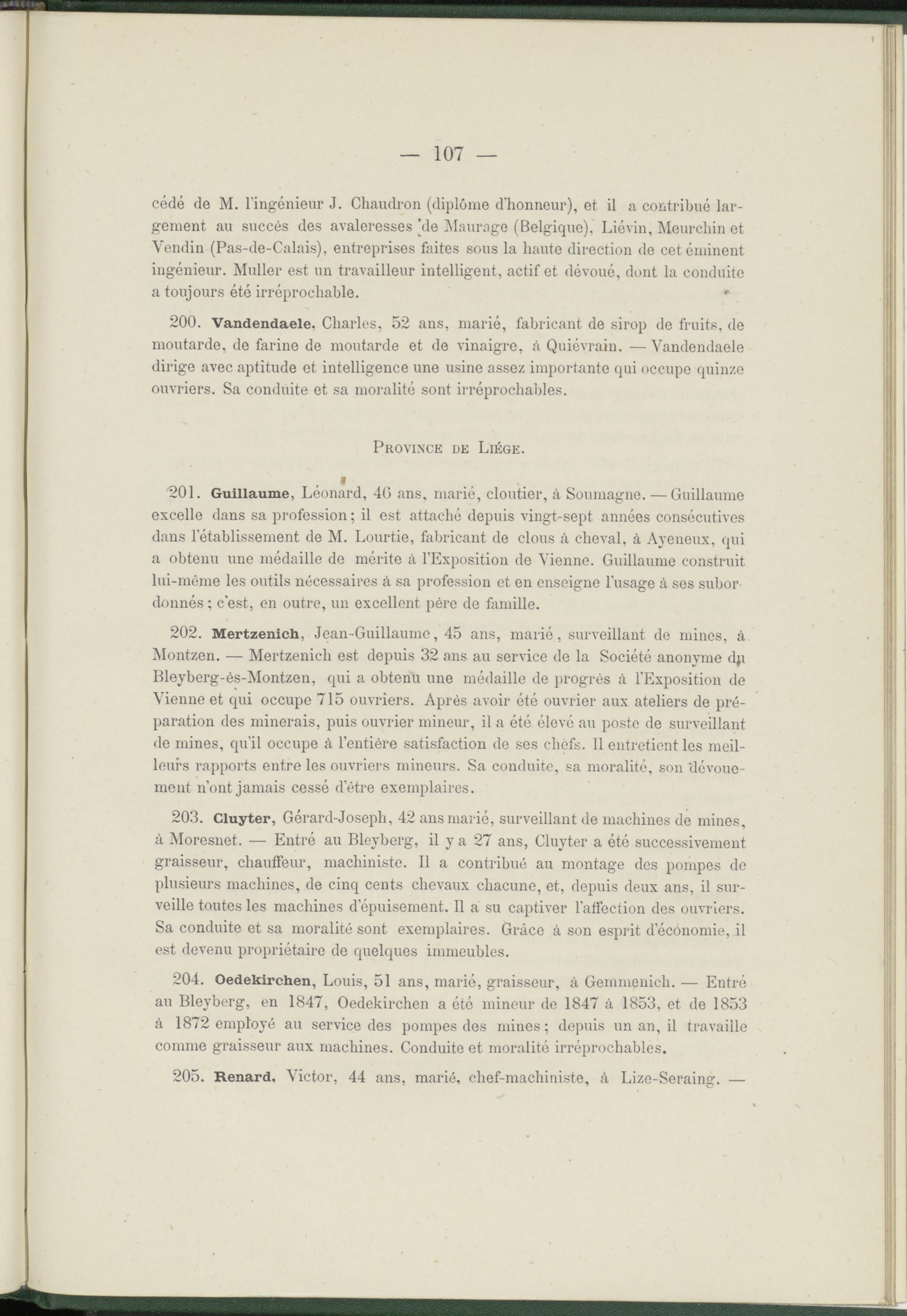 202. Mertzenich, Jean-Guillaume, 45 ans, marié, surveillant de mines, à Montzen. — Mertzenich est depuis 32 ans au service de la Société anonyme dp Bleyberg-ès-Montzen, qui a obtenu une médaille de progrès à l’Exposition de Vienne et qui occupe 715 ouvriers. Après avoir été ouvrier aux ateliers de préparation des minerais, puis ouvrier mineur, il a été élevé au poste de surveillant de mines, qu’il occupe à l’entière satisfaction de ses chefs. Il entretient les meilleurs rapports entre les ouvriers mineurs. Sa conduite, sa moralité, son dévouement n’ont jamais cessé d’être exemplaires.