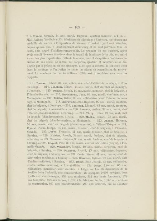 213. Damas, Hubert, 34 ans, célibataire, chef d’atelier de montage, à Mons lez-Liége. — 214. Joachim, Gérard, 45 ans, marié, chef d’atelier de montage, à Jemeppe. — 215. Damas, Joseph, 44 ans, marié, monteur, chef de brigade, à Flémalle-Grande. — 216. Berlaimont, Jean, 69 ans, marié, chef-monteur, à Montegnée. — 217. Bottin, Gilles, 38 ans, célibataire, chef d’atelier de montage, à Montegnée. —218. Margraffe, Jean-Baptiste, 29 ans, marié, monteur, chef de brigade, à Jemeppe.—219. Leclercq, Léonard, 63 ans, marié, monteur, chef de brigade, à Ans-et-Glain. —220. Lacroix, Arthur, 32 ans, marié, chef d’atelier (chaudronneries), à Seraing. — 221. Thiry, Gilles, 49 ans, veuf, chef de brigade (chaudronneries), à Fooz. — 222. Mathy, Gérard, 38 ans, marié, chef de brigade (chaudronneries), à Montegnée. — 223. Jacobs, Herman, 50 ans, marié, chef de brigade (chaudronneries), à Villers-l’Evêque. — 224. B[yard, Pierre-Joseph, 49 ans, marié, fondeur, chef de brigade, à Flémalle- Grande. — 225. Doyen, François, 41 ans, marié, fondeur, chef de brigr.de, à Seraing. — 226. Hubien, Joseph, 34 ans, marié, fondeur, chef de brigade, à Seraing — 227. Brouhon, Eugène, 30 ans. marié, fondeur, chef de brigade, à Seraing.— 228. Biquet, Paul, 30 ans, marié, chef de fabrication (forges), à Flémalle-Grande. — 229. Walthéry, Joseph, 42 ans, marié, forgeron, chef de brigade, à Seraing. — 230. Pagnoul, Arnold, 43 ans, célibataire, forgeron, chef de brigade, à Montegnée. — 231. Gorin, Simon, 41 ans, marié, chef de fabrication (aciéries), à Seraing.— 232. Chartier, Sylvain, 42 ans, marié, chef d’atelier (aciéries), à Seraing. — 233. Bayet, Jean-Joseph, 45 ans, célibataire, contre maître (aciéries), à Ans-et-Glain. — 234. Notet, Léonard, 65 ans, célibataire, menuisier, chef d’atelier, à Liège. — Les établissements de la Société John Cockerill, sont considérables ; ils occupent 9,000 ouvriers, dont 2,415 aux charbonnages, 853 aux minières, 321 aux hauts fourneaux, 278 aux fonderies, 268 aux forges, 1,018 à la fabrique de fer, 1,206 aux ateliers de consti’uction, 601 aux chaudronneries, 790 aux aciéries, 550 au chantier