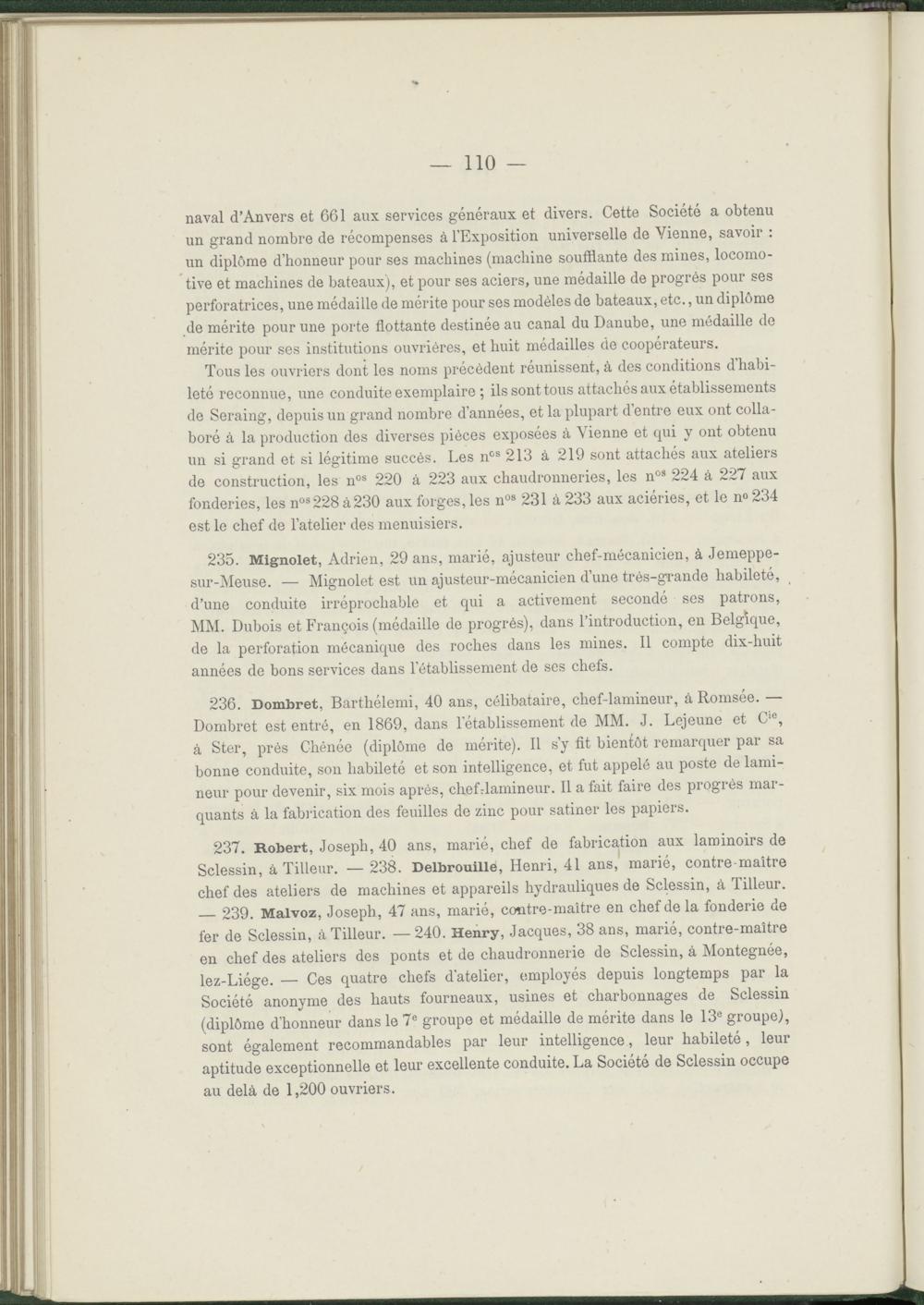 237. Robert, Joseph, 40 ans, marié, chef de fabrication aux laminoirs de Sclessin, à Tilleur. — 238. Delbrouille, Henri, 41 ans, marié, contre maître chef des ateliers de machines et appareils hydrauliques de Sclessin, à Tilleur. — 239. Malvoz, Joseph, 47 ans, marié, contre-maître en chef de la fonderie de fer de Sclessin, à Tilleur. —240. Henry, Jacques, 38 ans, marié, contre-maître en chef des ateliers des ponts et de chaudronnerie de Sclessin, à Montegnée, lez-Liége. — Ces quatre chefs d'atelier, employés depuis longtemps par la Société anonyme des hauts fourneaux, usines et charbonnages de Sclessin (diplôme d’honneur dans le 7 e groupe et médaille de mérite dans le 13 e groupe), sont également recommandables par leur intelligence, leur habileté, leur aptitude exceptionnelle et leur excellente conduite. La Société de Sclessin occupe au delà de 1,200 ouvriers.