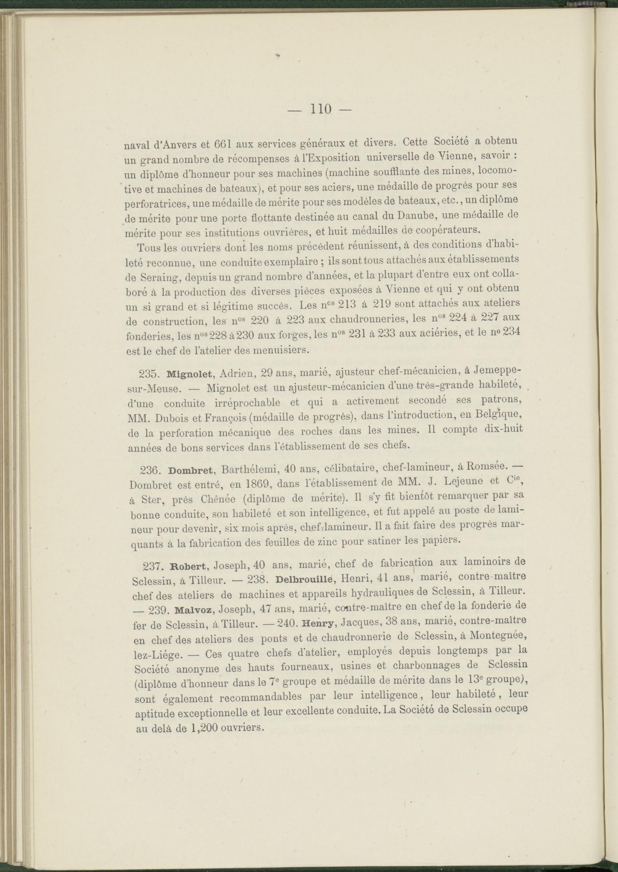 Tous les ouvriers dont les noms précèdent réunissent, à des conditions d’habileté reconnue, une conduite exemplaire ; ils sont tous attachés aux établissements de Seraing, depuis un grand nombre d’années, et la plupart d’entre eux ont collaboré à la production des diverses pièces exposées à Vienne et qui y ont obtenu un si grand et si légitime succès. Les n os 213 à 219 sont attachés aux ateliers de construction, les n os 220 à 223 aux chaudronneries, les n 03 224 à 227 aux fonderies, les n os 228 à230 aux forges, les n os 231 à 233 aux aciéries, et le n° 234 est le chef de l’atelier des menuisiers.