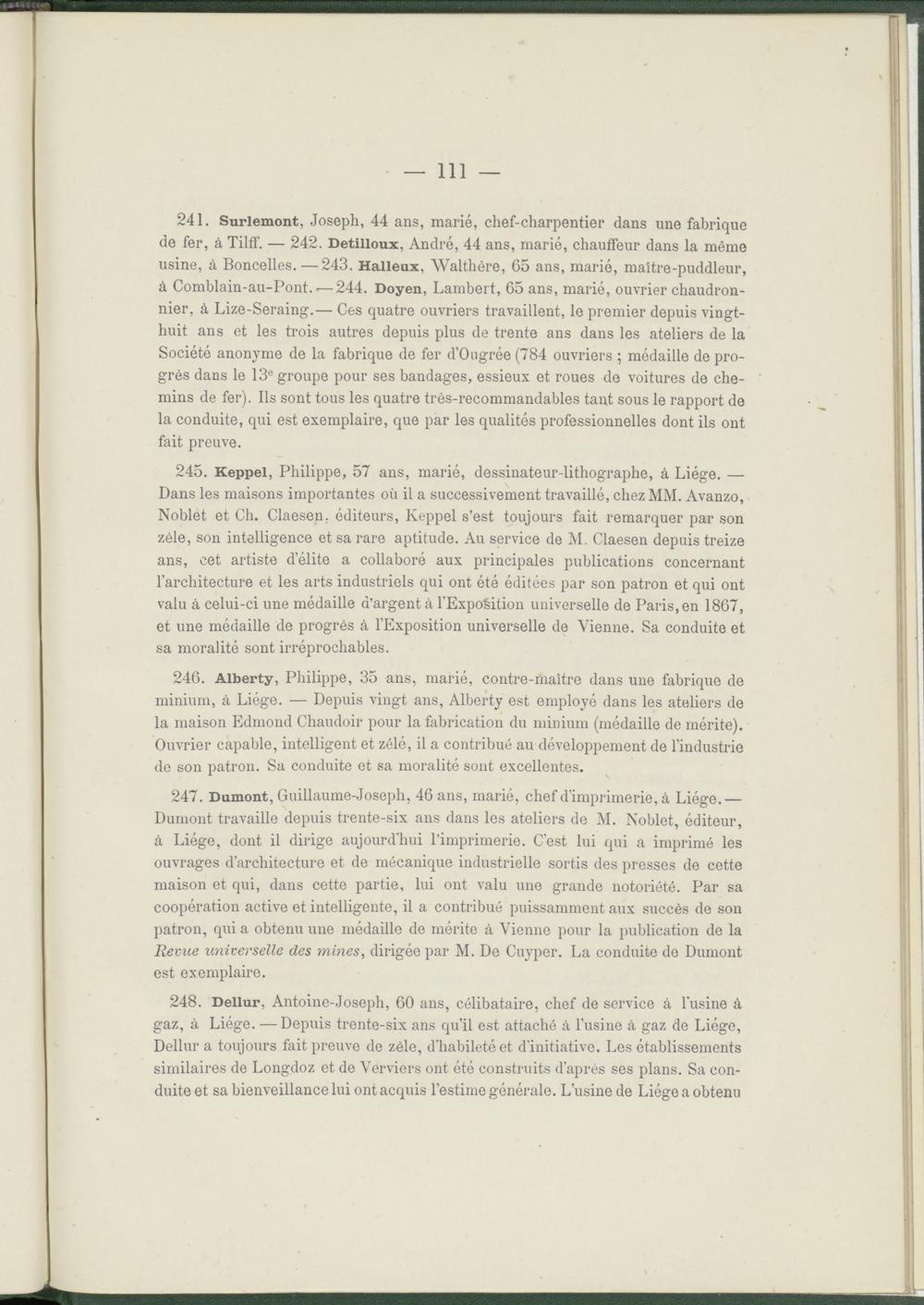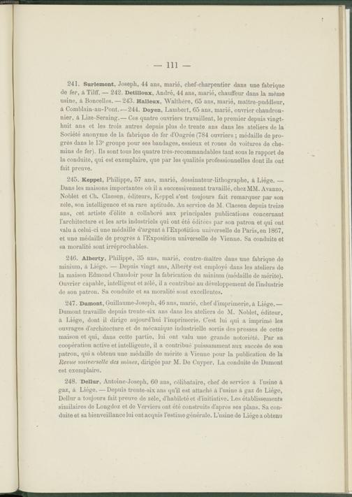 245. Keppel, Philippe, 57 ans, marié, dessinateur-lithographe, à Liège. — Dans les maisons importantes où il a successivement travaillé, chez MM. Avanzo, Noblet et Ch. Claesen. éditeurs, Iveppel s’est toujours fait remarquer par son zèle, son intelligence et sa rare aptitude. Au service de M. Claesen depuis treize ans, cet artiste d’élite a collaboré aux principales publications concernant l’architecture et les arts industriels qui ont été éditées par son patron et qui ont valu à celui-ci une médaille d’argent à l’Exposition universelle de Paris, en 1867, et une médaille de progrès à l’Exposition universelle de Vienne. Sa conduite et sa moralité sont irréprochables.