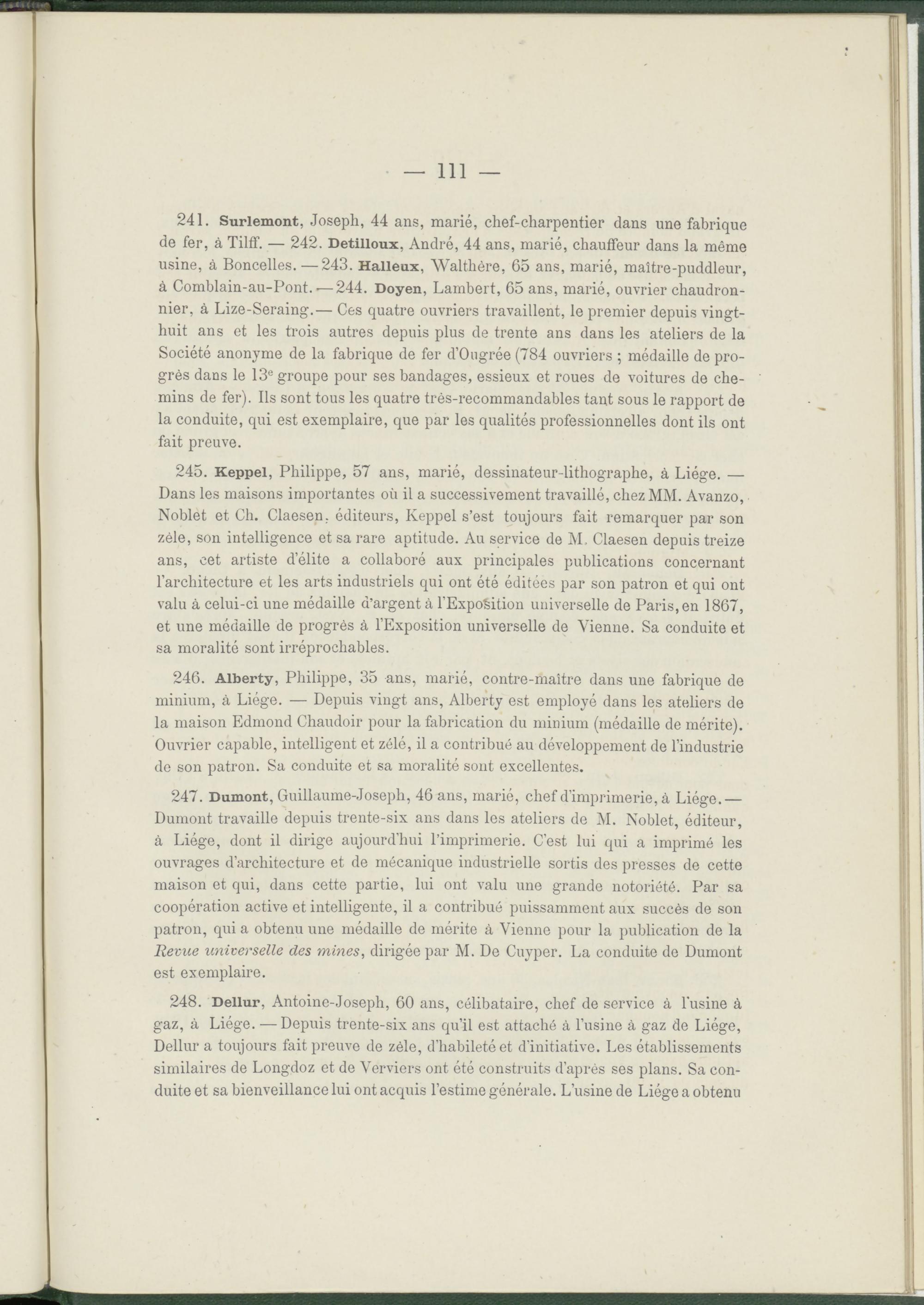 241. Surlemont, Joseph, 44 ans, marié, chef-charpentier dans une fabrique de fer, à Tilff. — 242. Detilloux, André, 44 ans, marié, chauffeur dans la même usine, à Boncelles. —243. Halleux, Walthère, 65 ans, marié, maître-puddleur, à Comblain-au-Pont. •—244. Doyen, Lambert, 65 ans, marié, ouvrier chaudronnier, à Lize-Seraing.— Ces quatre ouvriers travaillent, le premier depuis vingt- huit ans et les trois autres depuis plus de trente ans dans les ateliers de la Société anonyme de la fabrique de fer d’Ougrée (784 ouvriers ; médaille de progrès dans le 13 e groupe pour ses bandages, essieux et roues de voitures de chemins de fer). Ils sont tous les quatre très-recommandables tant sous le rapport de la conduite, qui est exemplaire, que par les qualités professionnelles dont ils ont fait preuve.