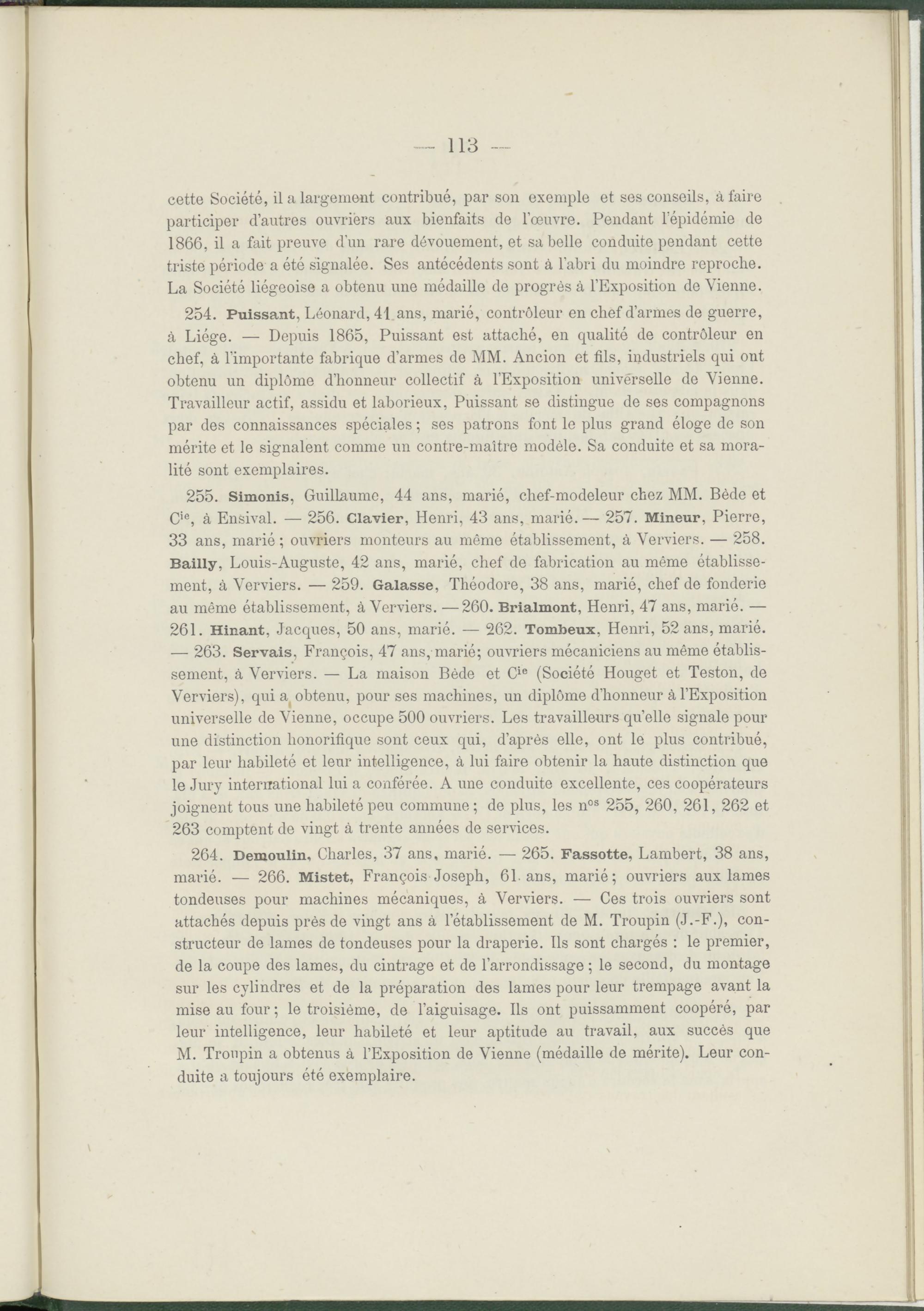 255. Simonis, Guillaume, 44 ans, marié, chef-modeleur chez MM. Bède et C ie , à Ensival. — 256. Clavier, Henri, 43 ans, marié. — 257. Mineur, Pierre, 33 ans, marié ; ouvriers monteurs au même établissement, à Verviers. — 258. Bailly, Louis-Auguste, 42 ans, marié, chef de fabrication au même établissement, à Verviers. — 259. Galasse, Théodore, 38 ans, marié, chef de fonderie au même établissement, à Verviers. —260. Brialmont, Henri, 47 ans, marié. — 261. Hinant, Jacques, 50 ans, marié. — 262. Tombeux, Henri, 52 ans, marié. — 263. Servais, François, 47 ans, marié; ouvriers mécaniciens au même établissement, à Verviers. — La maison Bède et C ie (Société Houget et Teston, de Verviers), qui a f obtenu, pour ses machines, un diplôme d’honneur à l’Exposition universelle de Vienne, occupe 500 ouvriers. Les travailleurs quelle signale pour une distinction honorifique sont ceux qui, d’après elle, ont le plus contribué, par leur habileté et leur intelligence, à lui faire obtenir la haute distinction que le Jury international lui a conférée. A une conduite excellente, ces coopérateurs joignent tous une habileté peu commune; de plus, les n os 255, 260, 261, 262 et 263 comptent de vingt à trente années de services.