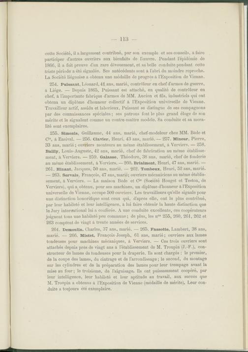 264. Demoulin, Charles, 37 ans, marié. — 265. Fassotte, Lambert, 38 ans, marié. — 266. Mistet, François Joseph, 61. ans, marié; ouvriers aux lames tondeuses pour machines mécaniques, à Verviers. — Ces trois ouvriers sont attachés depuis près de vingt ans à l’établissement de M. Troupin (J.-F.), constructeur de lames de tondeuses pour la draperie. Ils sont chargés : le premier, de la coupe des lames, du cintrage et de l’arrondissage ; le second, du montage sur les cylindres et de la préparation des lames pour leur trempage avant la mise au four; le troisième, de l’aiguisage. Ils ont puissamment coopéré, par leur intelligence, leur habileté et leur aptitude au travail, aux succès que M. Troupin a obtenus à l’Exposition de Vienne (médaille de mérite). Leur conduite a toujours été exemplaire.