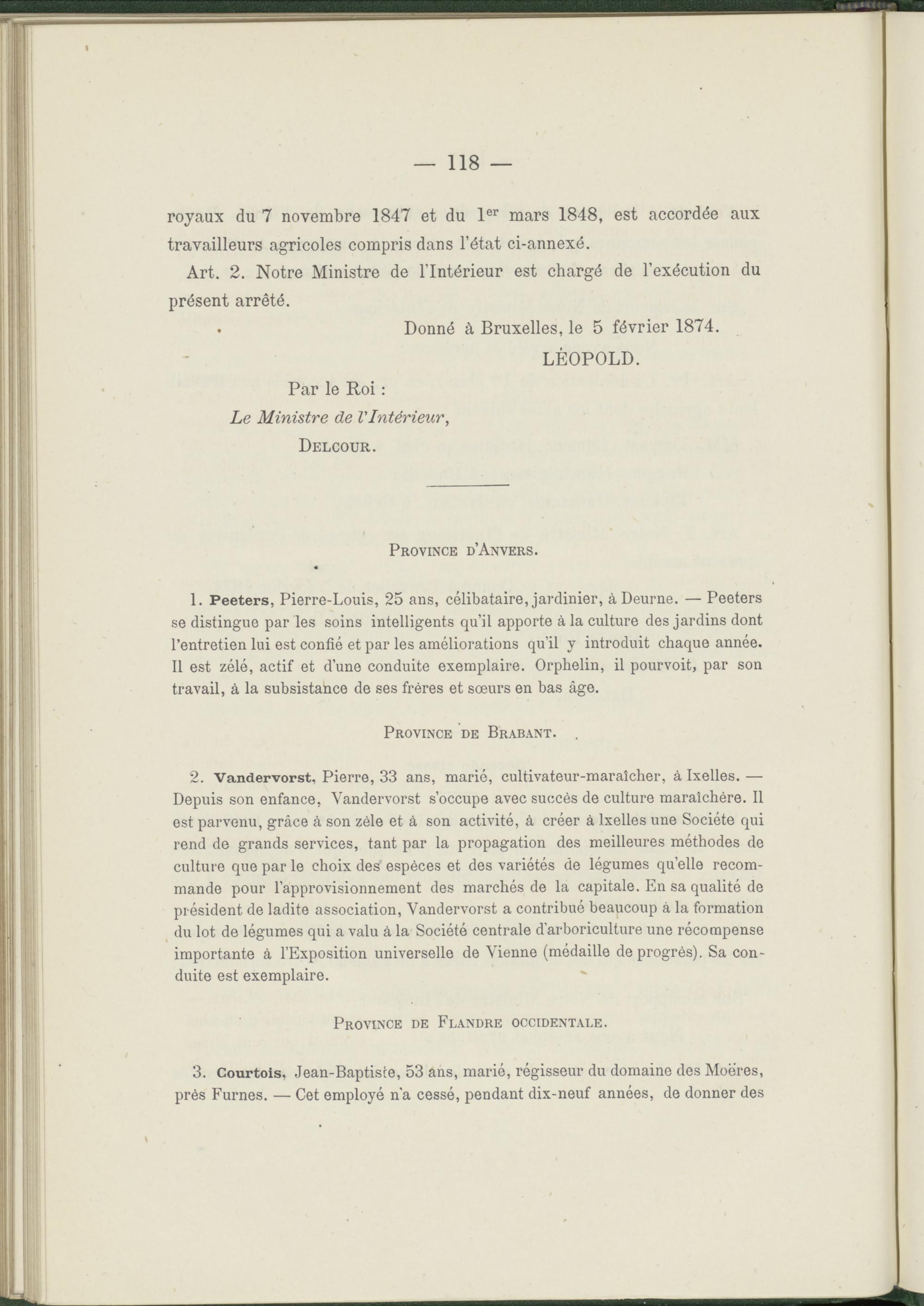 1. Peeters, Pierre-Louis, 25 ans, célibataire, jardinier, à Deurne. — Peeters se distingue par les soins intelligents qu’il apporte à la culture des jardins dont l’entretien lui est confié et par les améliorations qu’il y introduit chaque année. Il est zélé, actif et d’une conduite exemplaire. Orphelin, il pourvoit, par son travail, à la subsistance de ses frères et sœurs en bas âge.