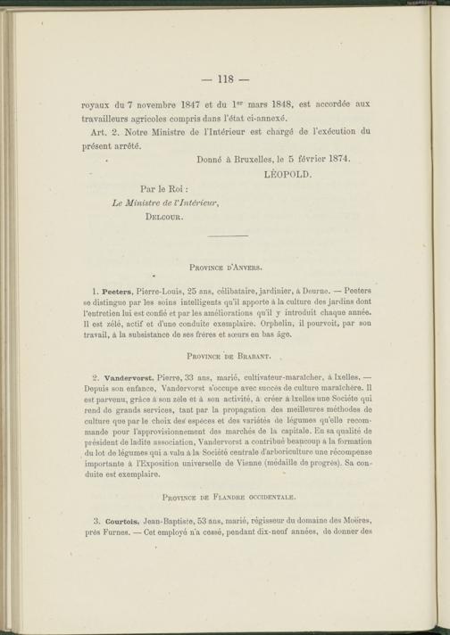2. Vandervorst, Pierre, 33 ans, marié, cultivateur-maraîcher, à Ixelles. — Depuis son enfance, Vandervorst s’occupe avec succès de culture maraîchère. Il est parvenu, grâce à son zèle et à son activité, à créer à Ixelles une Société qui rend de grands services, tant par la propagation des meilleures méthodes de culture que par le choix des espèces et des variétés de légumes qu’elle recommande pour l’approvisionnement des marchés de la capitale. En sa qualité de président de ladite association, Vandervorst a contribué beaucoup à la formation du lot de légumes qui a valu à la Société centrale d’arboriculture une récompense importante à l’Exposition universelle de Vienne (médaille de progrès). Sa conduite est exemplaire.