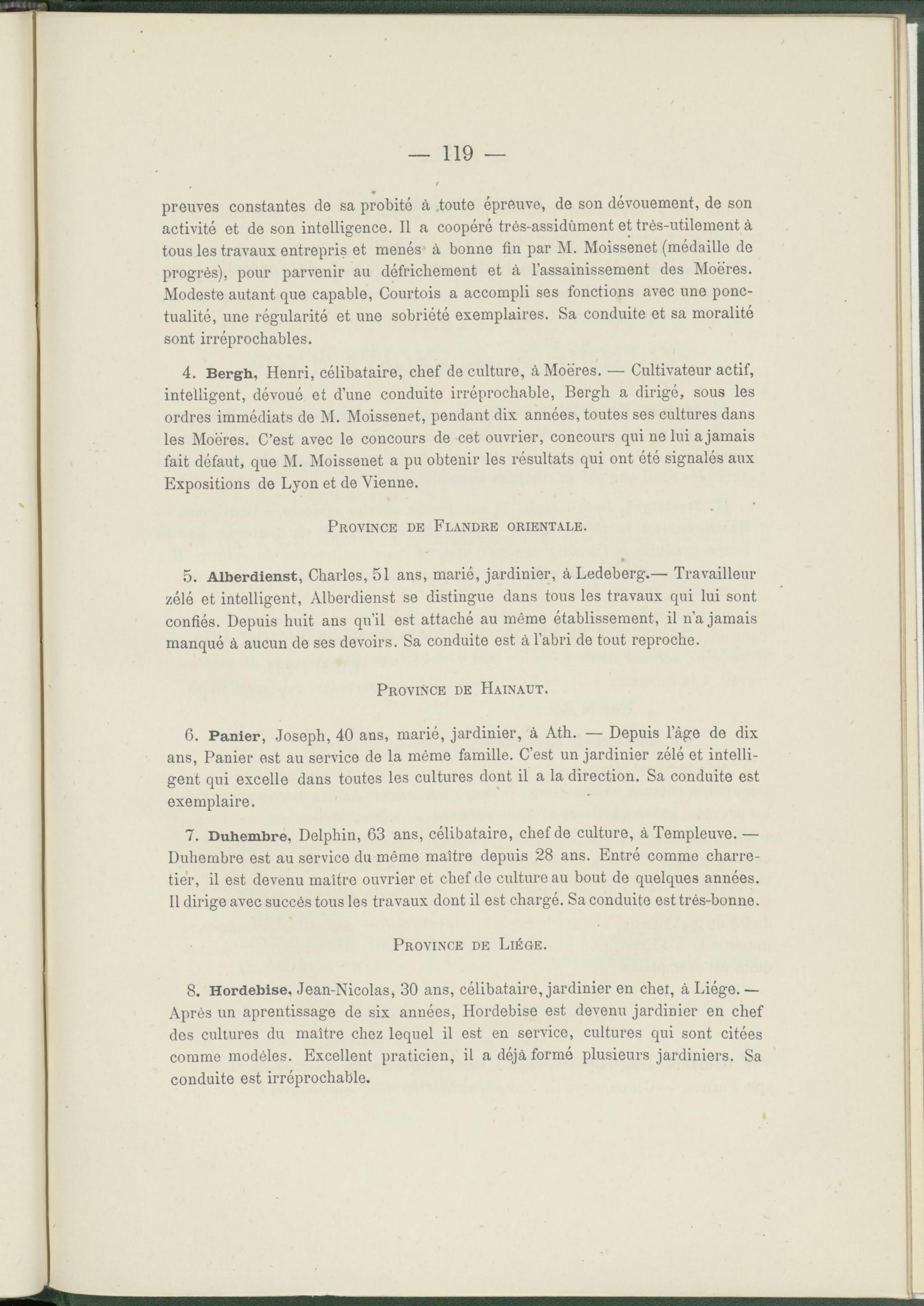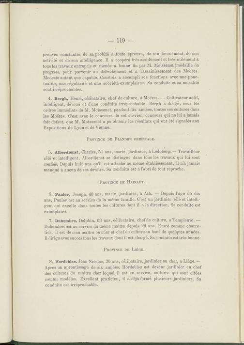 5. Alberdienst, Charles, 51 ans, marié, jardinier, à Ledeberg.— Travailleur zélé et intelligent, Alberdienst se distingue dans tous les travaux qui lui sont confiés. Depuis huit ans qu’il est attaché au même établissement, il n’a jamais manqué à aucun de ses devoirs. Sa conduite est à l’abri de tout reproche.