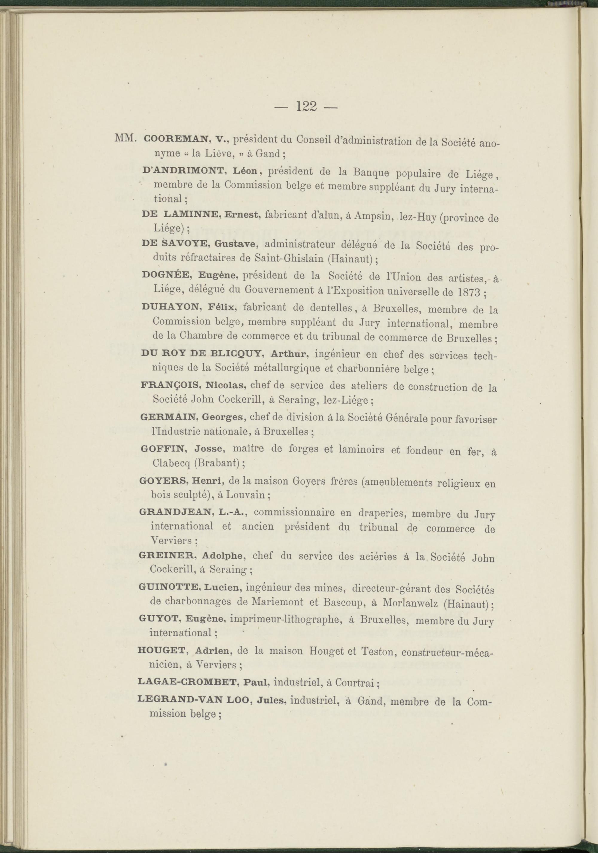 D’ANDRIMONT, Léon , président de la Banque populaire de Liège, membre de la Commission belge et membre suppléant du Jury international ;