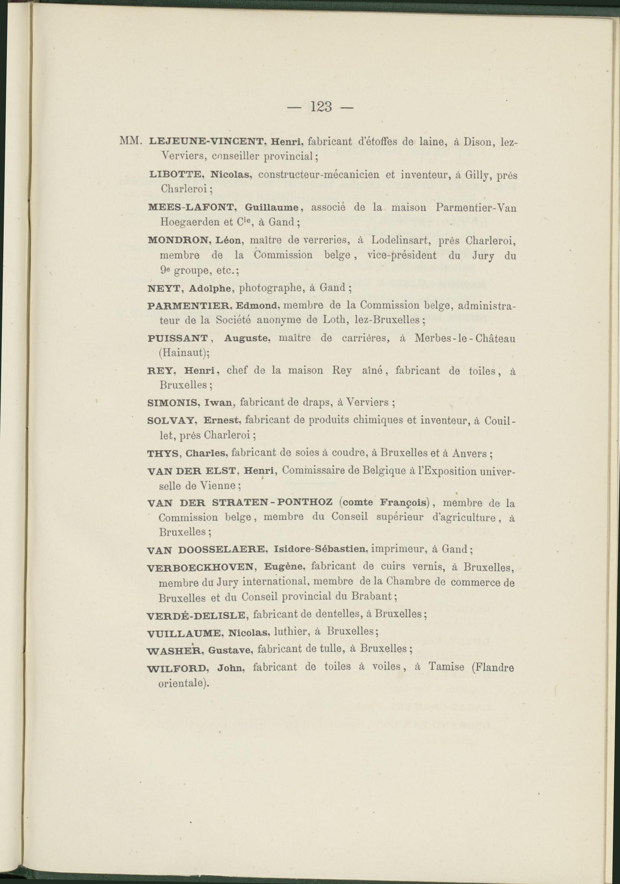VERBOECKHOVEN, Eugène, fabricant de cuirs vernis, à Bruxelles, membre du Jury international, membre de la Chambre de commerce de Bruxelles et du Conseil provincial du Brabant ;