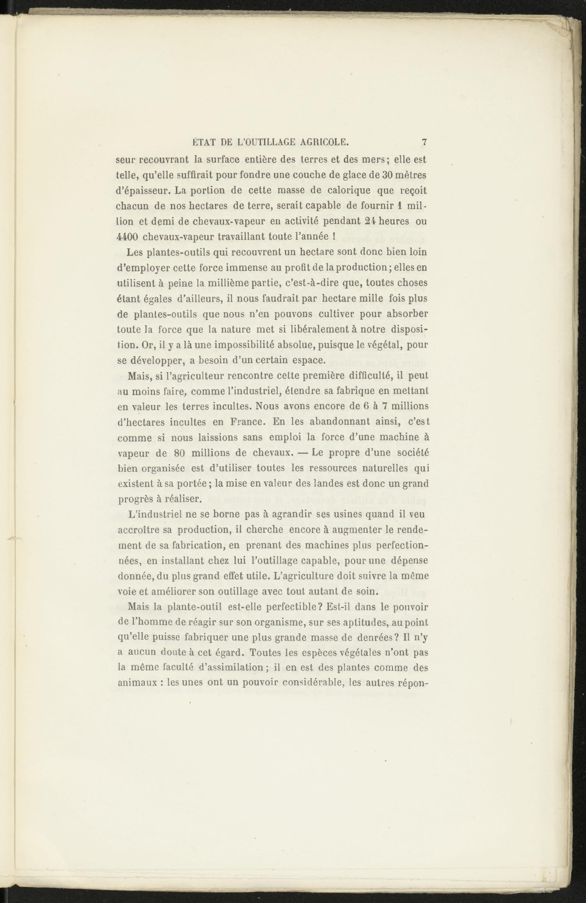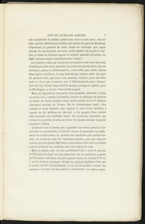Mais la plante-outil est-elle perfectible? Est-il dans le pouvoir de l’homme de réagir sur son organisme, sur ses aptitudes, au point qu’elle puisse fabriquer une plus grande masse de denrées? Il n’y a aucun doute à cet égard. Toutes les espèces végétales n’ont pas la même faculté d’assimilation ; il en est des plantes comme des animaux : les unes ont un pouvoir considérable, les autres répon-