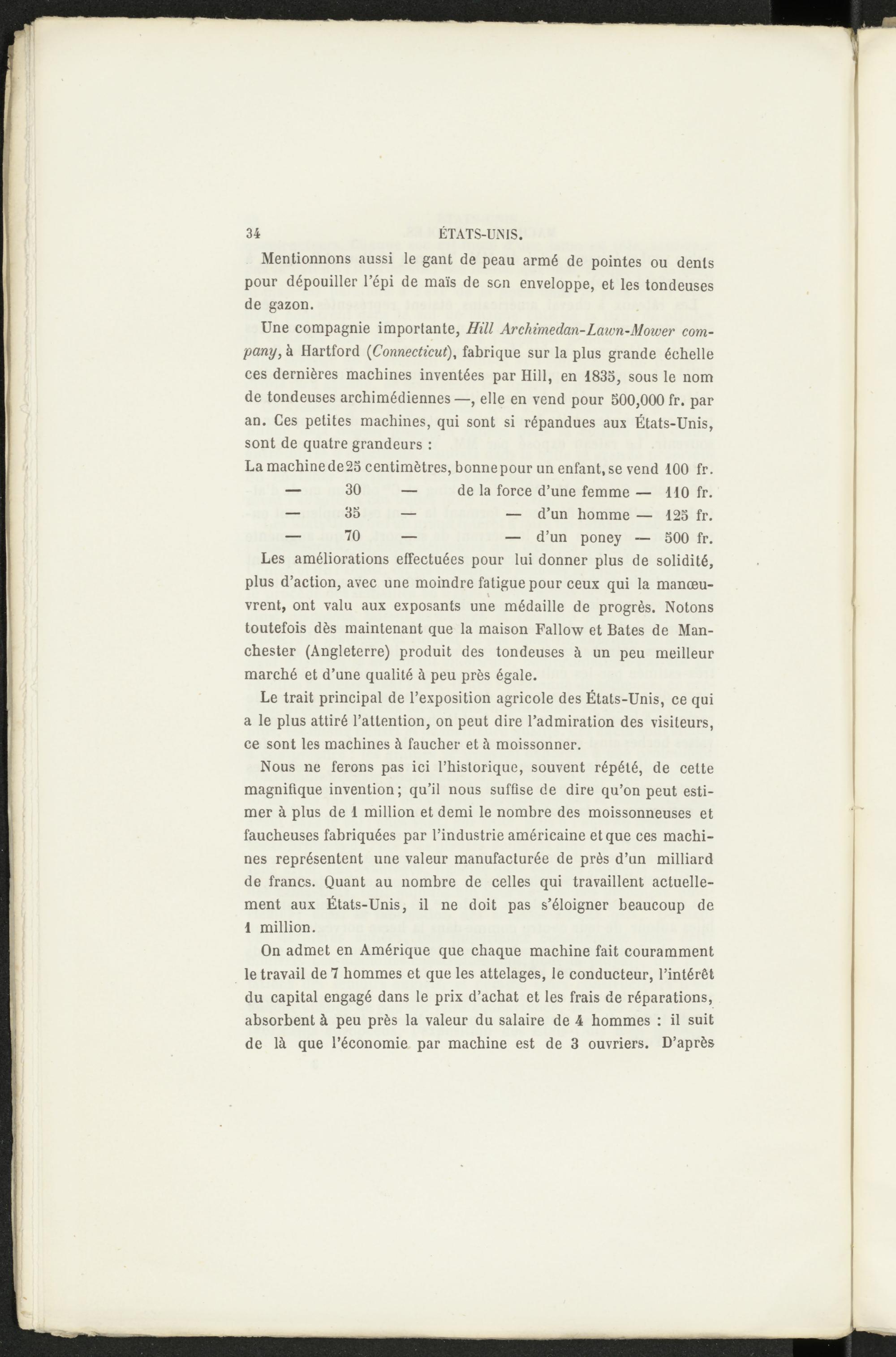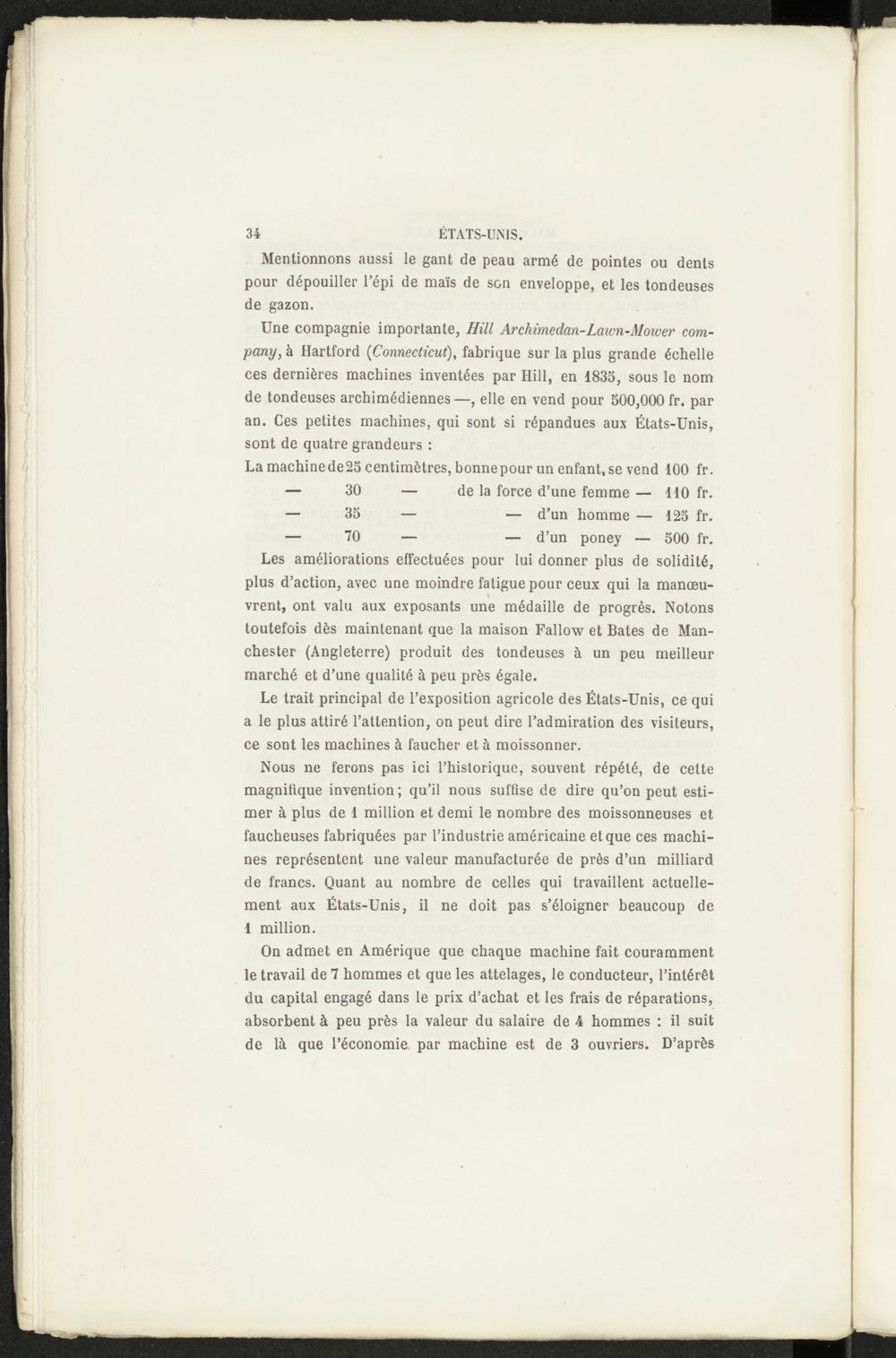 Une compagnie importante, Hill Arckimedan-Laivn-Mower company , à Hartford ( Connecticut ), fabrique sur la plus grande échelle ces dernières machines inventées par Hill, en 1835, sous le nom de tondeuses archimédiennes—, elle en vend pour 500,000 fr. par an. Ces petites machines, qui sont si répandues aux États-Unis, sont de quatre grandeurs :