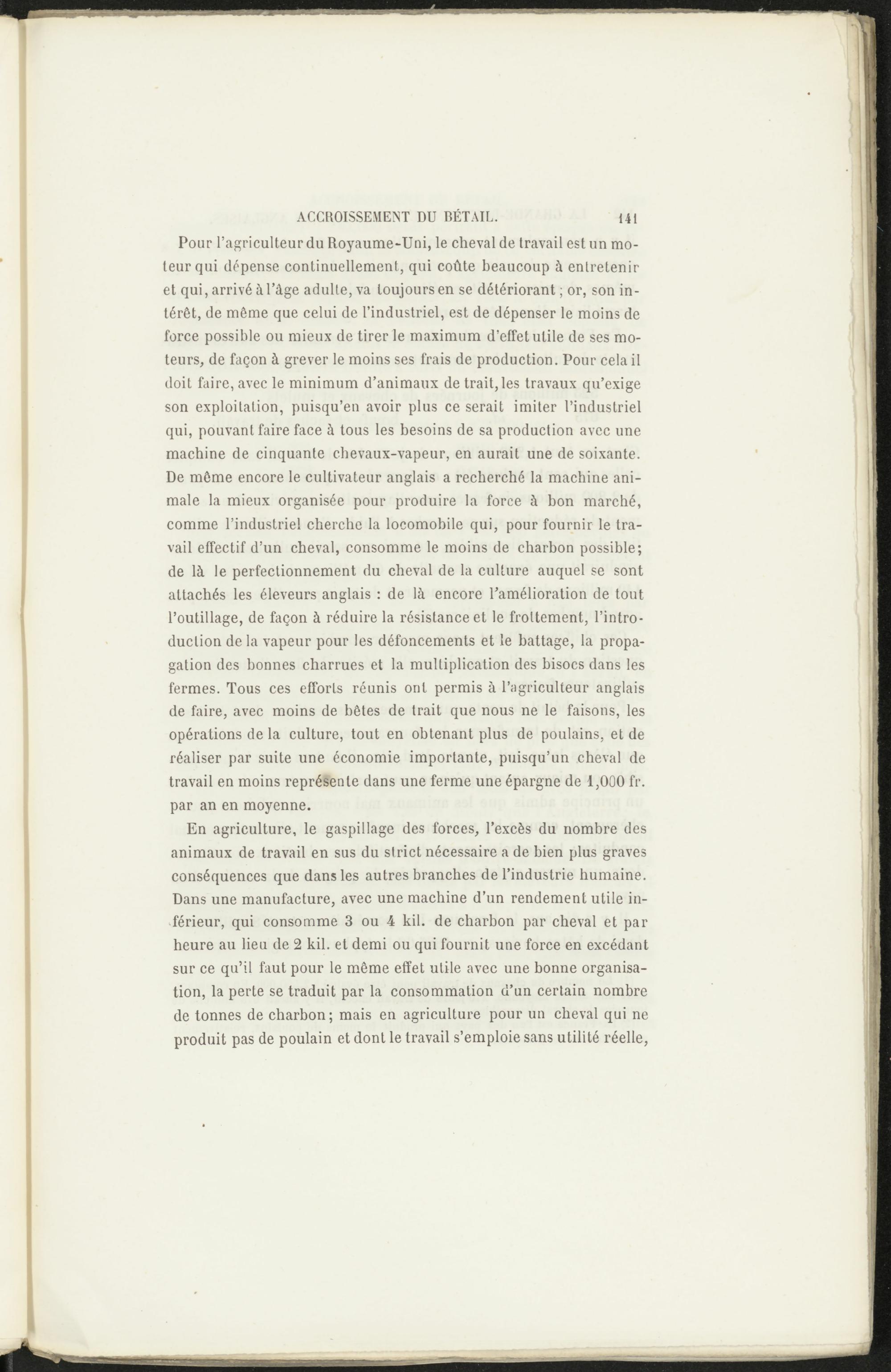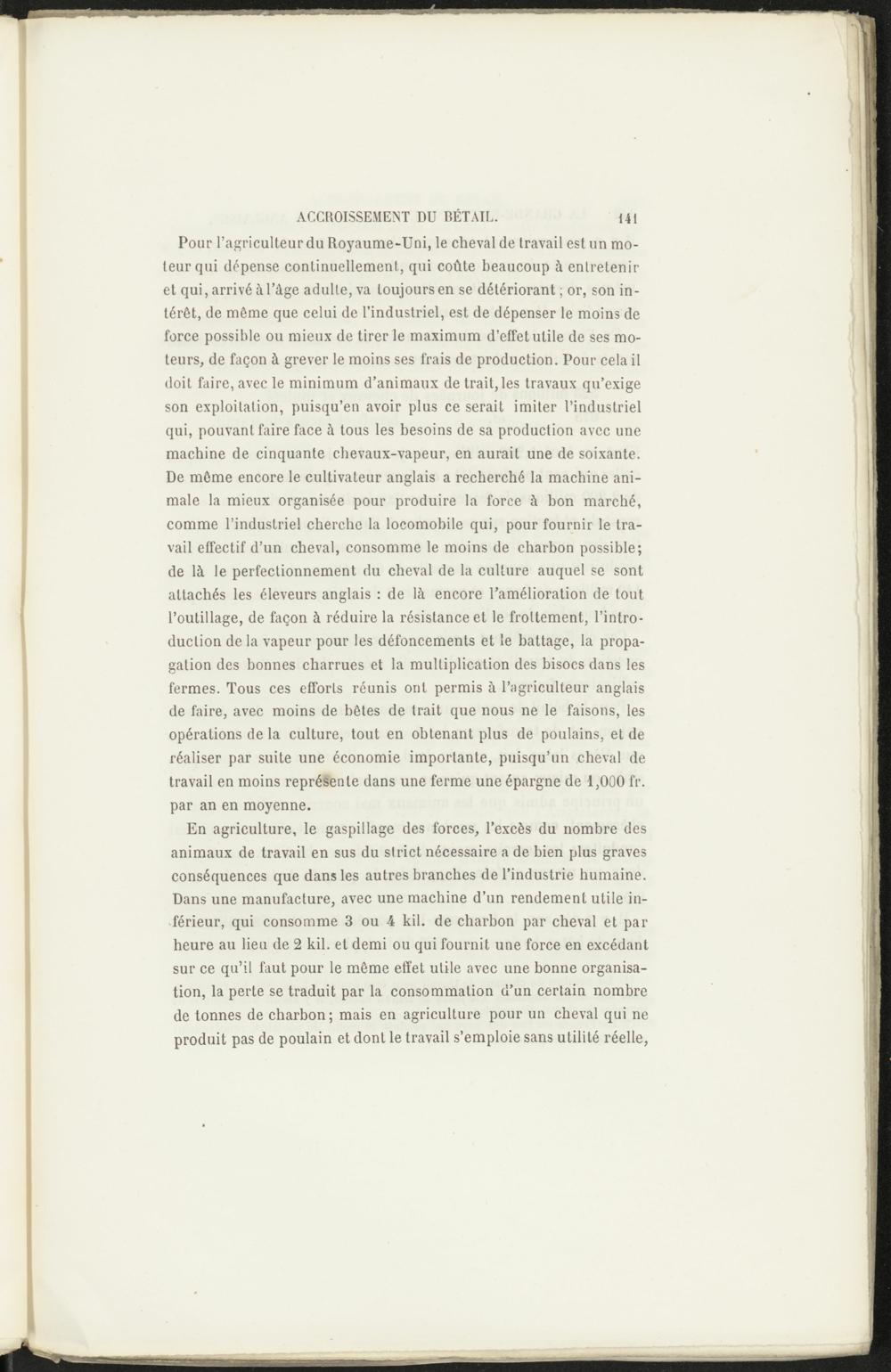 En agriculture, le gaspillage des forces, l’excès du nombre des animaux de travail en sus du strict nécessaire a de bien plus graves conséquences que dans les autres branches de l’industrie humaine. Dans une manufacture, avec une machine d’un rendement utile inférieur, qui consomme 3 ou 4 kil. de charbon par cheval et par heure au lieu de 2 kil. et demi ou qui fournit une force en excédant sur ce qu’il faut pour le même effet utile avec une bonne organisation, la perte se traduit par la consommation d’un certain nombre de tonnes de charbon; mais en agriculture pour un cheval qui ne produit pas de poulain et dont le travail s’emploie sans utilité réelle,