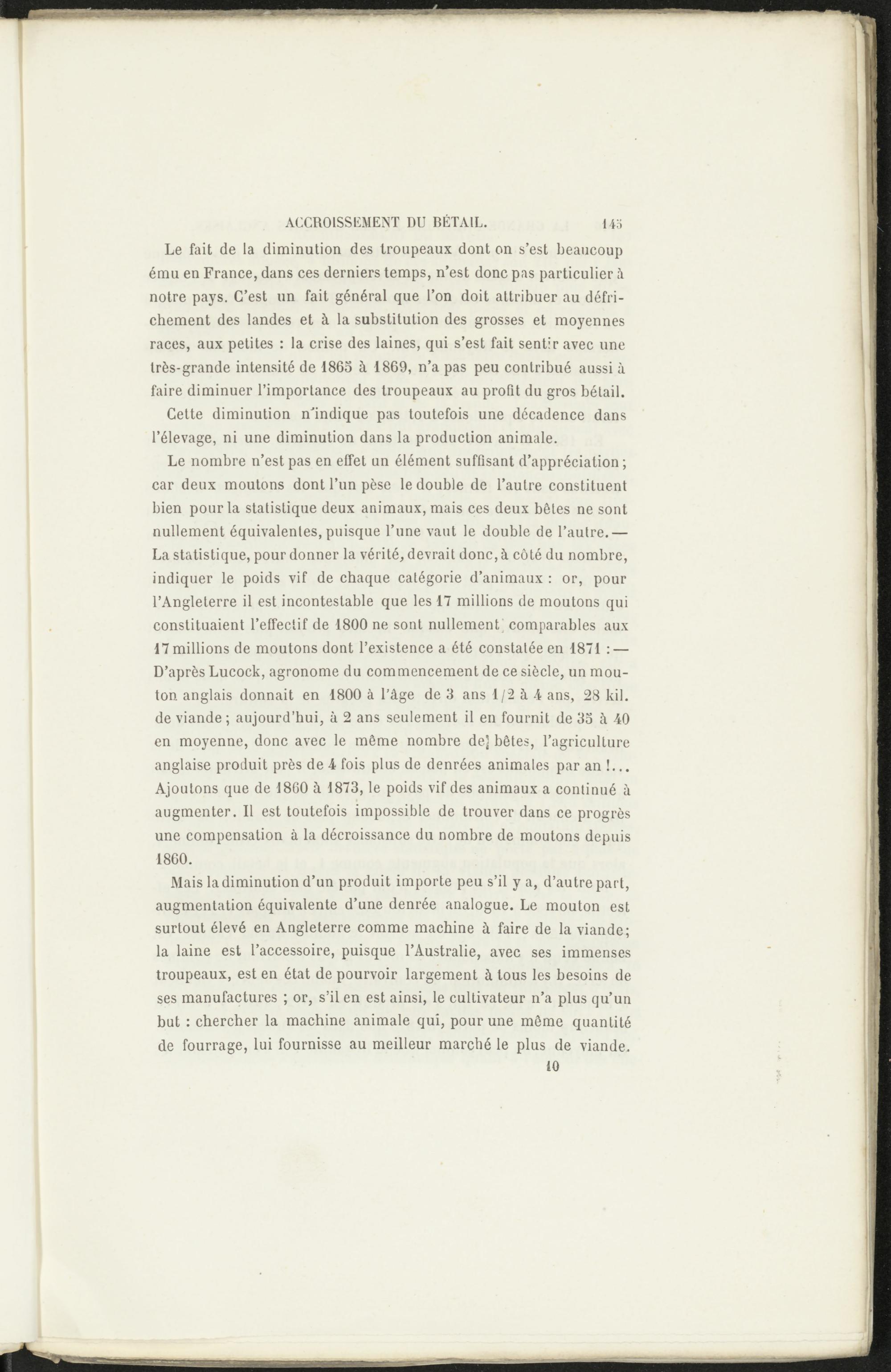 Mais la diminution d’un produit importe peu s’il y a, d’autre part, augmentation équivalente d’une denrée analogue. Le mouton est surtout élevé en Angleterre comme machine à faire de la viande; la laine est l’accessoire, puisque l’Australie, avec ses immenses troupeaux, est en état de pourvoir largement à tous les besoins de ses manufactures ; or, s’il en est ainsi, le cultivateur n’a plus qu’un but : chercher la machine animale qui, pour une même quantité de fourrage, lui fournisse au meilleur marché le plus de viande.