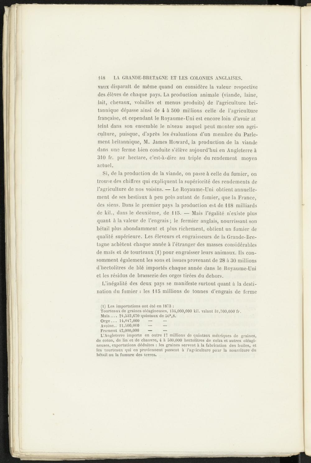 Si, de la production de la viande, on passe à celle du fumier, on trouve des chiffres qui expliquent la supériorité des rendements de l’agriculture de nos voisins. — Le Royaume-Uni obtient annuellement de ses bestiaux à peu près autant de fumier, que la France, des siens. Dans le premier pays la production est de 118 milliards de kil., dans le deuxième, de 115. — Mais l’égalité n’existe plus quant à la valeur de l’engrais ; le fermier anglais, nourrissant son bétail plus abondamment et plus richement, oblient un fumier de qualité supérieure. Les éleveurs et engraisseurs de la Grande-Bretagne achètent chaque année à l’étranger des masses considérables de maïs et de tourteaux (1) pour engraisser leurs animaux. Us consomment également les sons et issues provenant de 28 à 30 millions d’hectolitres de blé importés chaque année dans le Royaume-Uni et les résidus de brasserie des orges tirées du dehors.
