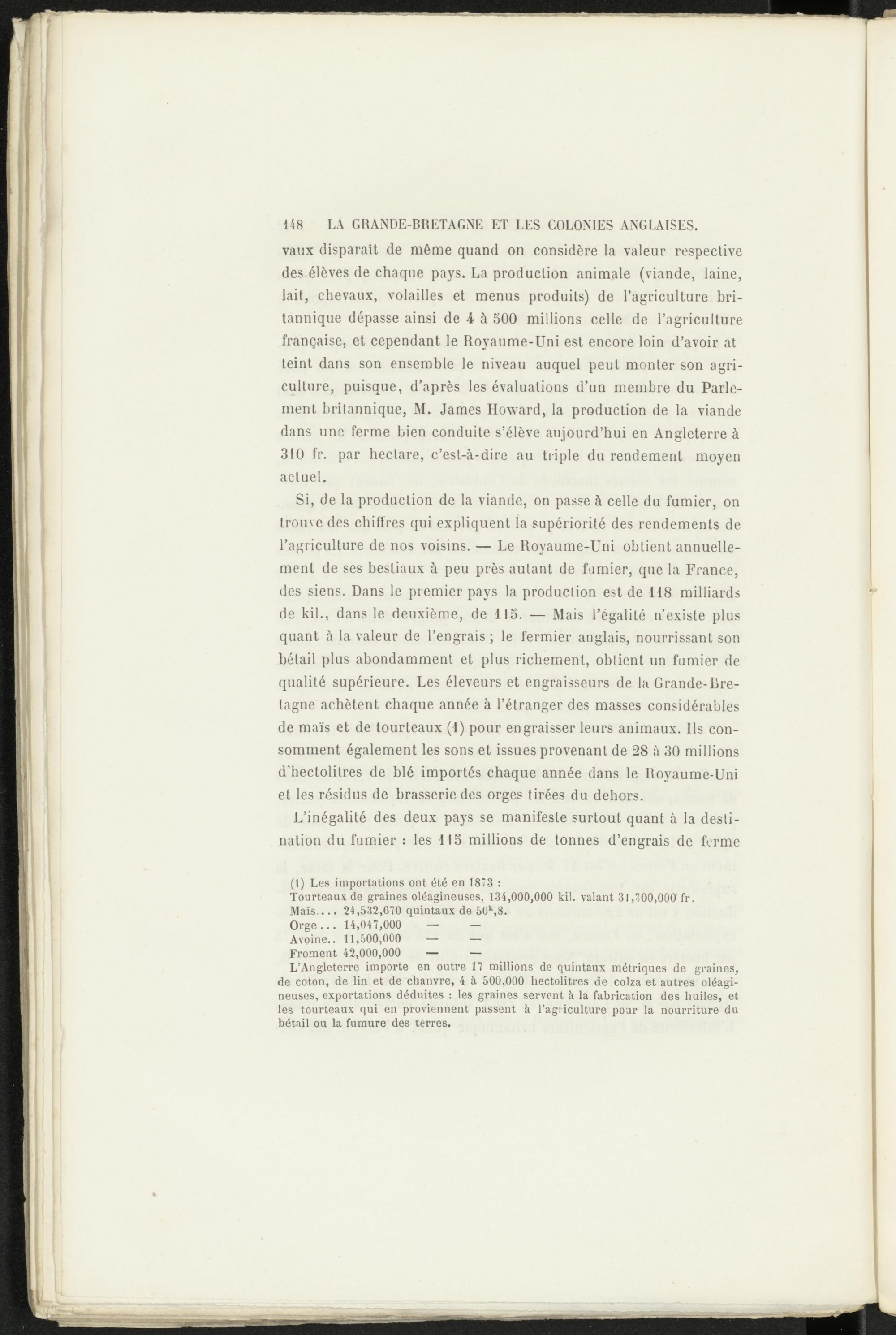 L’Angleterre importe en outre 17 millions de quintaux métriques de graines, de coton, de lin et de chanvre, 4 à. 500,000 hectolitres de colza et autres oléagineuses, exportations déduites : les graines servent à la fabrication des huiles, et les tourteaux qui en proviennent passent à l’agriculture pour la nourriture du bétail ou la fumure des terres.
