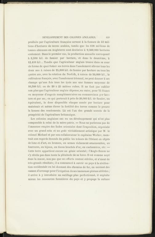 Les colonies anglaises ont eu un développement qui n’est plus comparable à celui de la mère-patrie. — Nous ne parlerons pas de l’immense empire des Indes orientales dont l’exposition, organisée avec un grand soin et un goût véritablement artistique par M. le colonel Michael et par son collaborateur le capitaine Walker, montrait aux regards étonnés du public les trésors de l’Orient en objets de luxe et d’art, en bronzes, en armes richement ornementées, en fourrures, en bijoux, en tissus brochés d’or, en cachemires, etc. — Cette terre appartient encore au génie oriental; lWnglo-Saxon ne s’y révèle pas dans toute la plénitude de sa force. Il est comme noyé dans la masse, non pas que ses efforts restent stériles, et n’aient de très-grands résultats ; il a commencé à ouvrir ce pays à la civilisation occidentale en lui donnant des chemins de fer, en ouvrant des canaux d’arrosage pour l’irrigation de ses immenses plaines altérées ; il arrive à y introduire un outillage plus perfectionné, il exploite mieux les ressources forestières du pays et y propage la culture