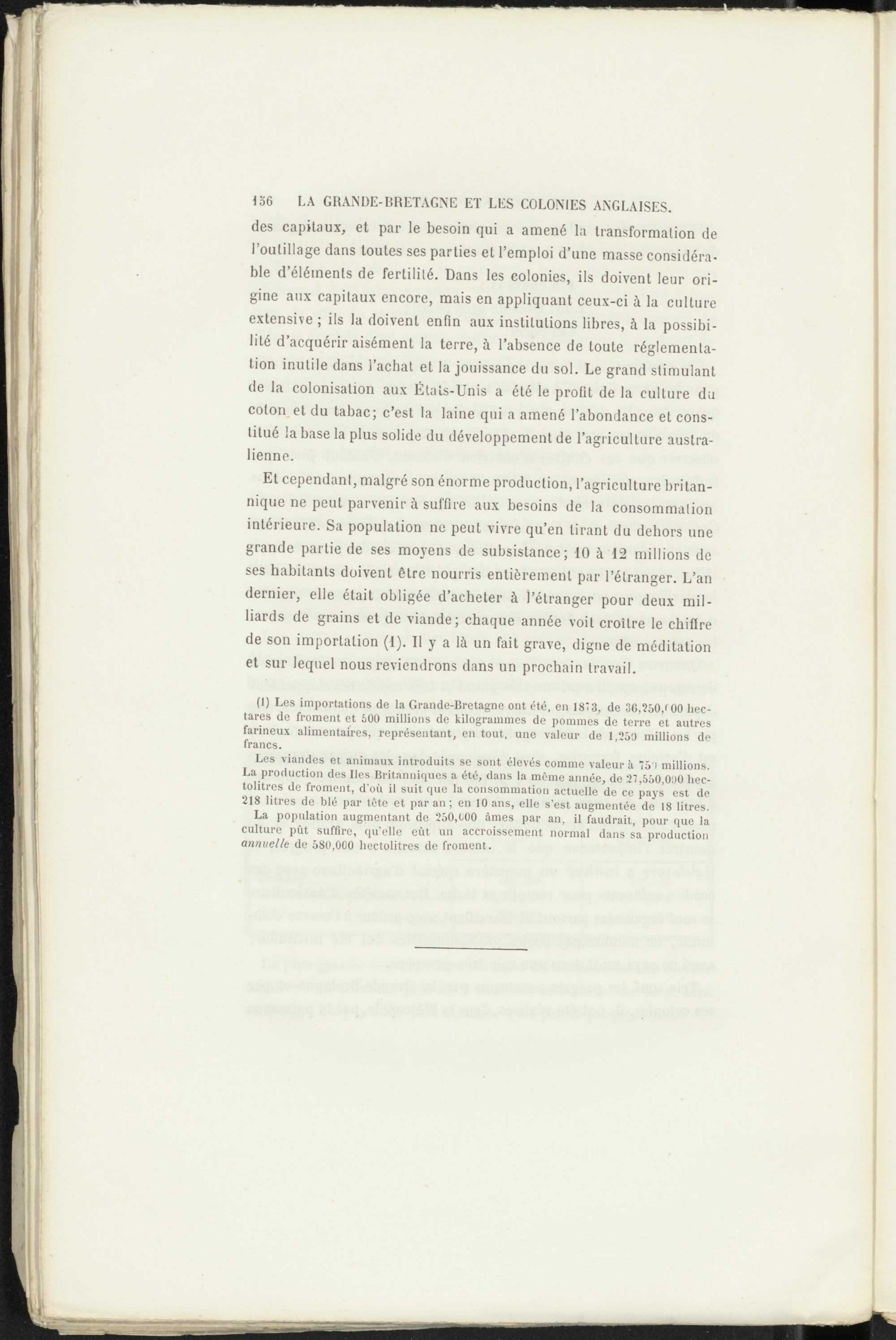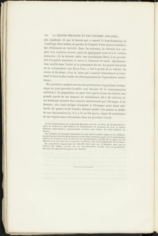 Les viandes et animaux introduits se sont élevés comme valeur à 75'» millions. La production des Iles Britanniques a été, dans la même année, de 27,550,000 hectolitres de froment, d'où il suit que la consommation actuelle de ce pays est de 218 litres de blé par tête et par an ; en 10 ans, elle s’est augmentée de 18 litres.