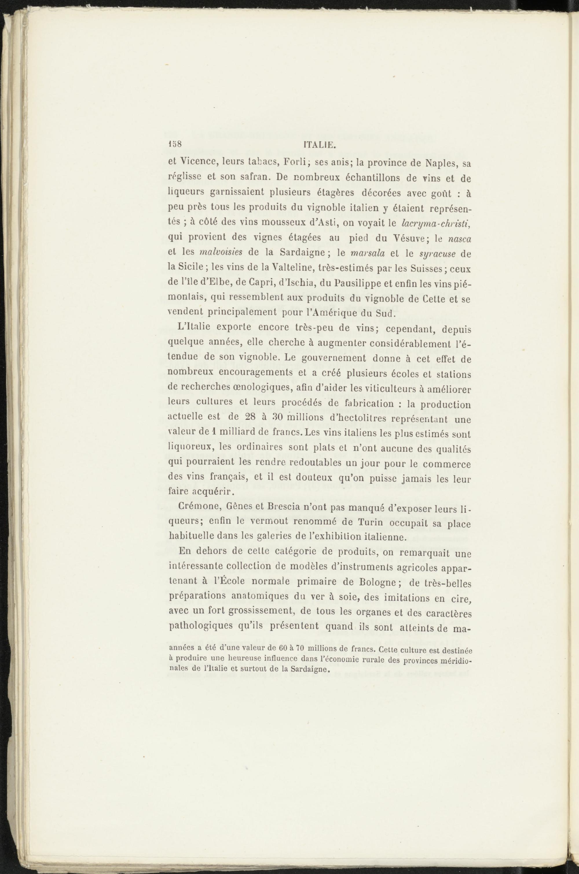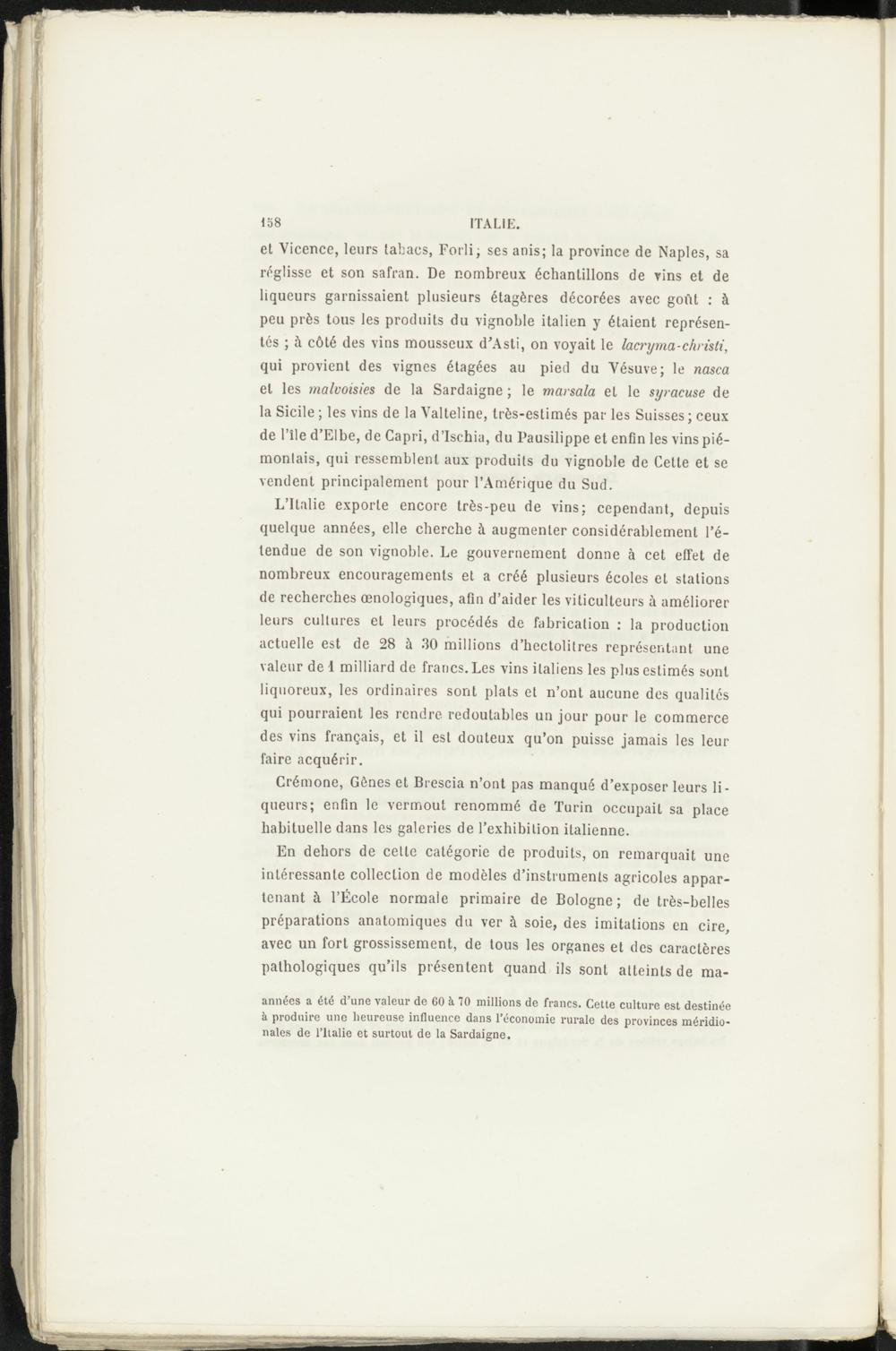 et Vicence, leurs tabacs, Forli; ses anis; la province de Naples, sa réglisse et son safran. De nombreux échantillons de vins et de liqueurs garnissaient plusieurs étagères décorées avec goût : à peu près tous les produits du vignoble italien y étaient représentés ; à côté des vins mousseux d’Asti, on voyait le lacryma-chrisli , qui provient des vignes étagées au pied du Yésuve; le nasca et les malvoisies de la Sardaigne ; le marsala et le Syracuse de la Sicile ; les vins de la Valteline, très-estimés par les Suisses ; ceux de nie d’Elbe, de Capri, d’Ischia, du Pausilippe et enfin les vins pié- monlais, qui ressemblent aux produits du vignoble de Cette et se vendent principalement pour l’Amérique du Sud.