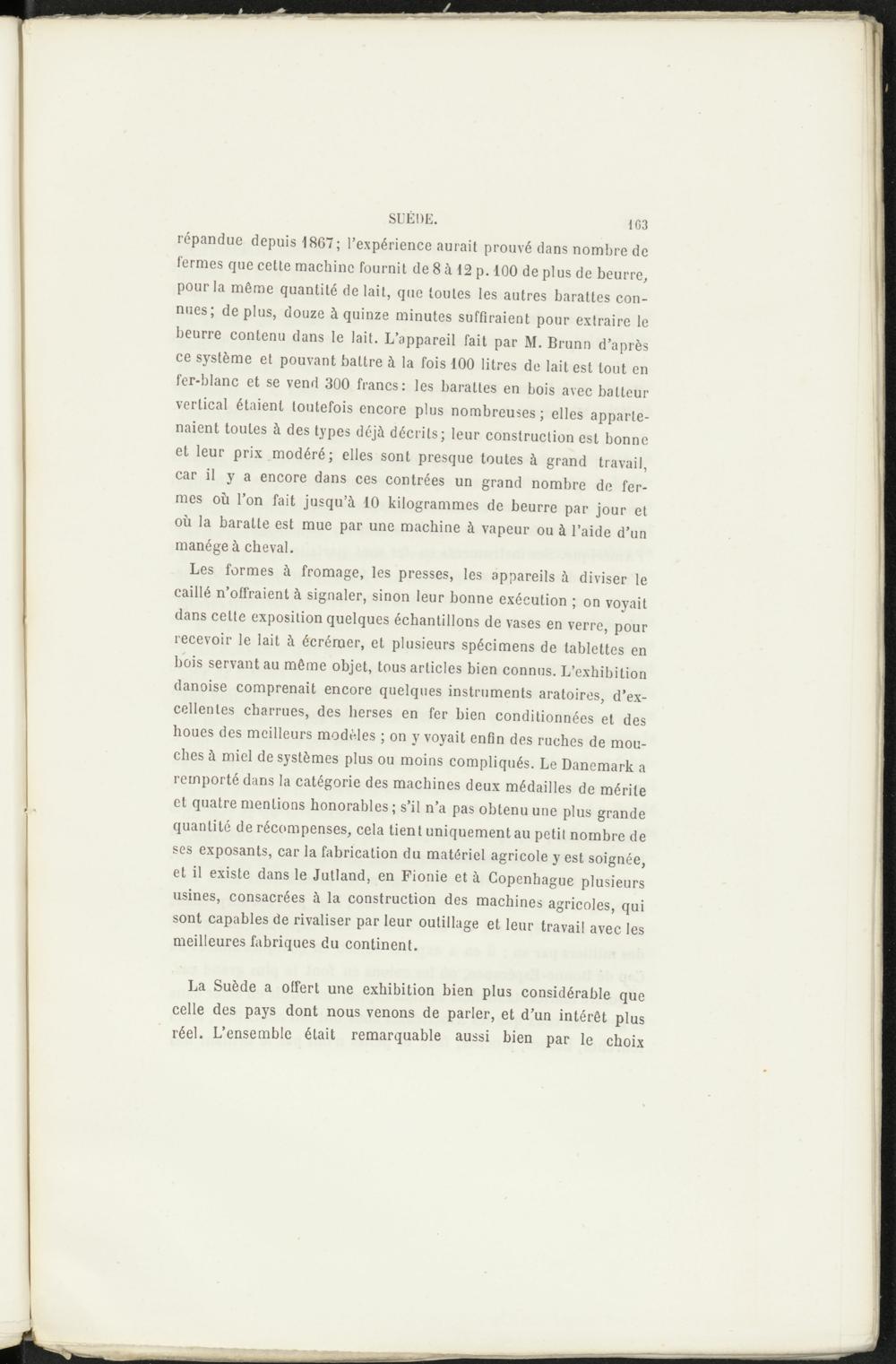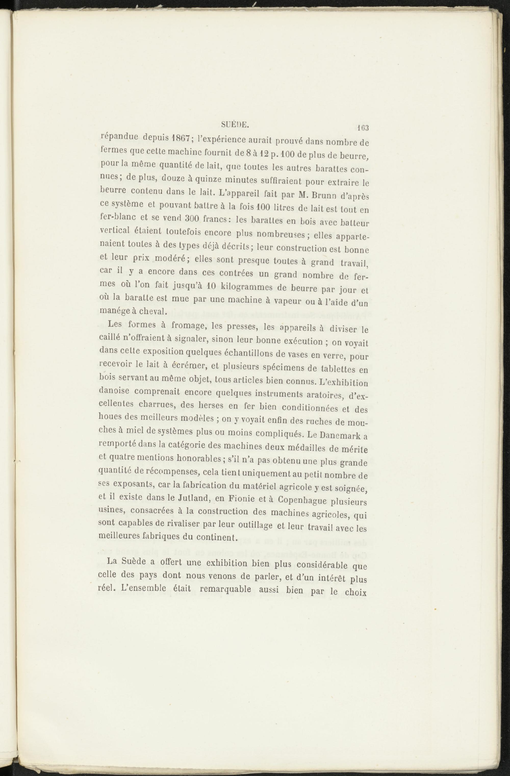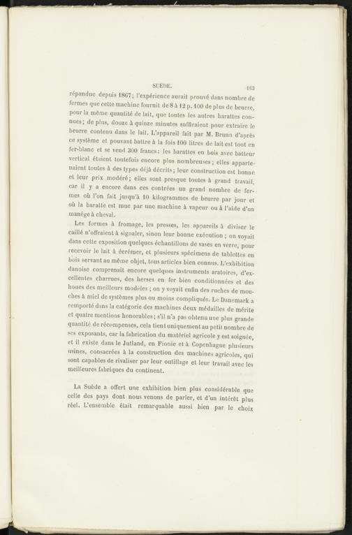 Les formes à fromage, les presses, les appareils à diviser le caillé n’offraient à signaler, sinon leur bonne exécution ; on voyait dans cette exposition quelques échantillons de vases en verre, pour recevoir le lait à écrémer, et plusieurs spécimens de tablettes en bois servant au même objet, tous articles bien connus. L’exhibition danoise comprenait encore quelques instruments aratoires, d’excellentes charrues, des herses en fer bien conditionnées et des houes des meilleurs modèles ; on y voyait enfin des ruches de mouches à miel de systèmes plus ou moins compliqués. Le Danemark a remporté dans la catégorie des machines deux médailles de mérite et quatre mentions honorables ; s’il n’a pas obtenu une plus grande quantité de récompenses, cela tient uniquement au petit nombre de ses exposants, car la fabrication du matériel agricole y est soignée, et il existe dans le Jutland, en Fionie et à Copenhague plusieurs usines, consacrées à la construction des machines agricoles, qui sont capables de rivaliser par leur outillage et leur travail avec les meilleures fabriques du continent.