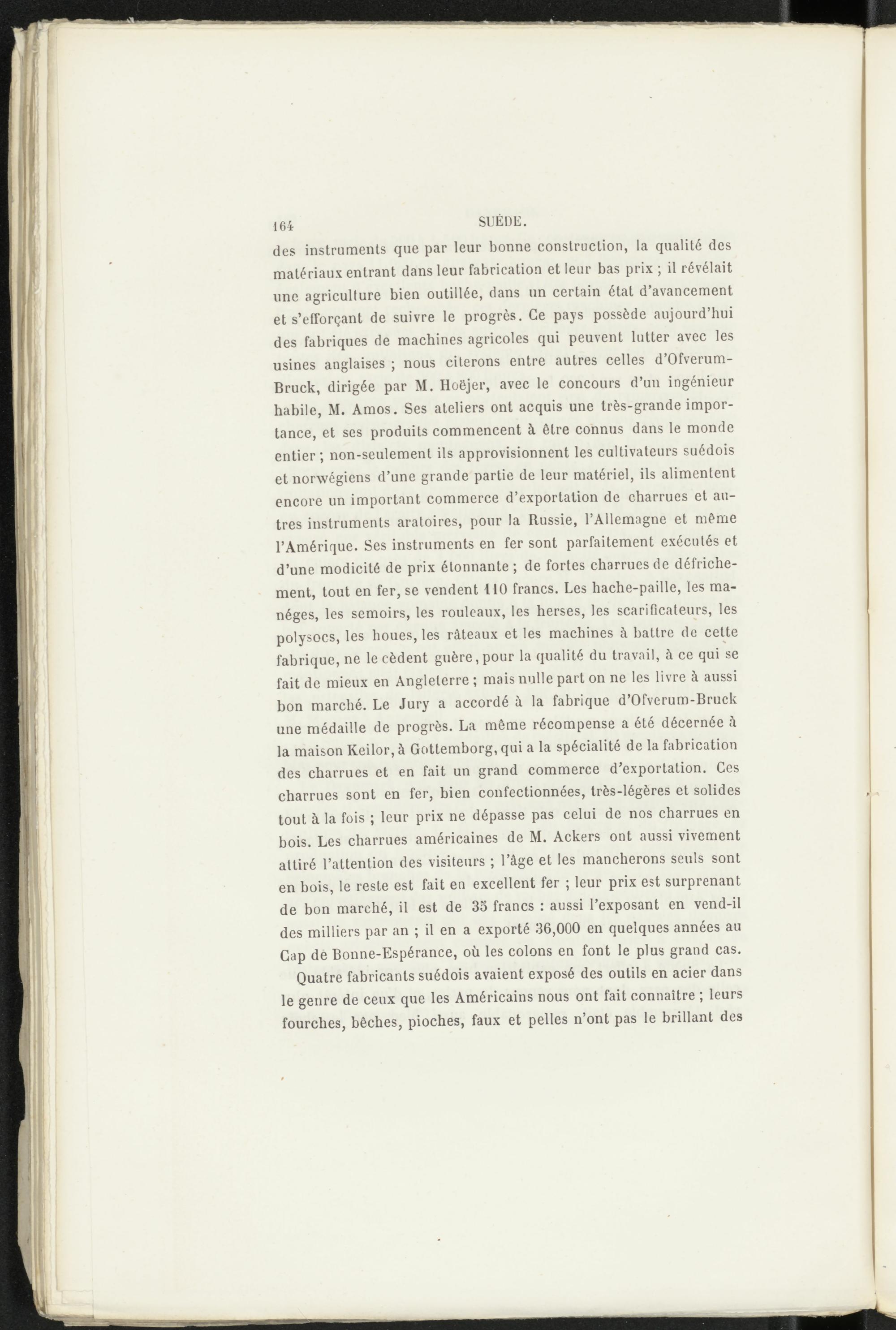des instruments que par leur bonne construction, la qualité des matériaux entrant dans leur fabrication et leur bas prix ; il révélait une agriculture bien outillée, dans un certain état d’avancement et s’efforçant de suivre le progrès. Ce pays possède aujourd’hui des fabriques de machines agricoles qui peuvent lutter avec les usines anglaises ; nous citerons entre autres celles d’Ofverum- Bruck, dirigée par M. Hoëjer, avec le concours d’un ingénieur habile, M. Amos. Ses ateliers ont acquis une très-grande importance, et ses produits commencent à être connus dans le monde entier; non-seulement ils approvisionnent les cultivateurs suédois et norwégiens d’une grande partie de leur matériel, ils alimentent encore un important commerce d’exportation de charrues et autres instruments aratoires, pour la Russie, l’Allemagne et même l’Amérique. Ses instruments en fer sont parfaitement exécutés et d’une modicité de prix étonnante ; de fortes charrues de défrichement, tout en fer, se vendent 110 francs. Les hache-paille, les manèges, les semoirs, les rouleaux, les herses, les scarificateurs, les polysocs, les houes, les râteaux et les machines à battre de cette fabrique, ne le cèdent guère,pour la qualité du travail, à ce qui se fait de mieux en Angleterre ; mais nulle part on ne les livre à aussi bon marché. Le Jury a accordé à la fabrique d’Ofverum-Bruck une médaille de progrès. La même récompense a été décernée â la maison Keilor, à Gottemborg, qui a la spécialité de la fabrication des charrues et en fait un grand commerce d’exportation. Ces charrues sont en fer, bien confectionnées, très-légères et solides tout à la fois ; leur prix ne dépasse pas celui de nos charrues en bois. Les charrues américaines de M. Ackers ont aussi vivement attiré l’attention des visiteurs ; l’âge et les mancherons seuls sont en bois, le reste est fait en excellent fer ; leur prix est surprenant de bon marché, il est de 35 francs : aussi l’exposant en vend-il des milliers par an ; il en a exporté 36,000 en quelques années au Gap de Bonne-Espérance, où les colons en font le plus grand cas.