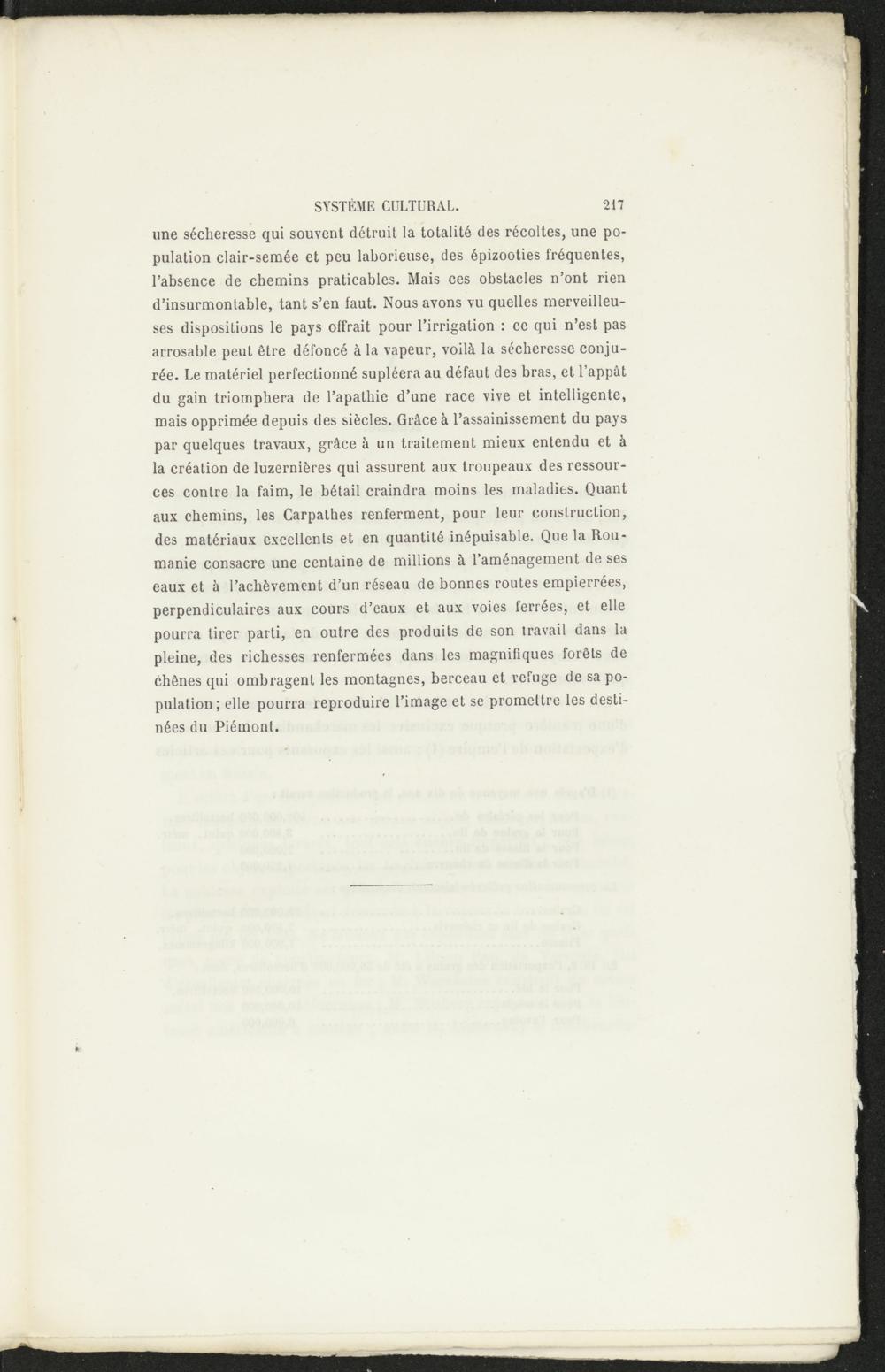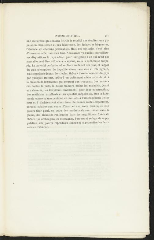 une sécheresse qui souvent détruit la totalité des récoltes, une population clair-semée et peu laborieuse, des épizooties fréquentes, l’absence de chemins praticables. Mais ces obstacles n’ont rien d’insurmontable, tant s’en faut. Nous avons vu quelles merveilleuses dispositions le pays offrait pour l’irrigation : ce qui n’est pas arrosable peut être défoncé à la vapeur, voilà la sécheresse conjurée. Le matériel perfectionné supléeraau défaut des bras, et l’appât du gain triomphera de l’apatliie d’une race vive et intelligente, mais opprimée depuis des siècles. Grâce à l’assainissement du pays par quelques travaux, grâce à un traitement mieux entendu et à la création de luzernières qui assurent aux troupeaux des ressources contre la faim, le bétail craindra moins les maladies. Quant aux chemins, les Carpathes renferment, pour leur construction, des matériaux excellents et en quantité inépuisable. Que la Roumanie consacre une centaine de millions à l’aménagement de ses eaux et à l’achèvement d’un réseau de bonnes routes empierrées, perpendiculaires aux cours d’eaux et aux voies ferrées, et elle pourra tirer parti, en outre des produits de son travail dans la pleine, des richesses renfermées dans les magnifiques forêts de chênes qui ombragent les montagnes, berceau et refuge de sa population; elle pourra reproduire l’image et se promettre les destinées du Piémont.
