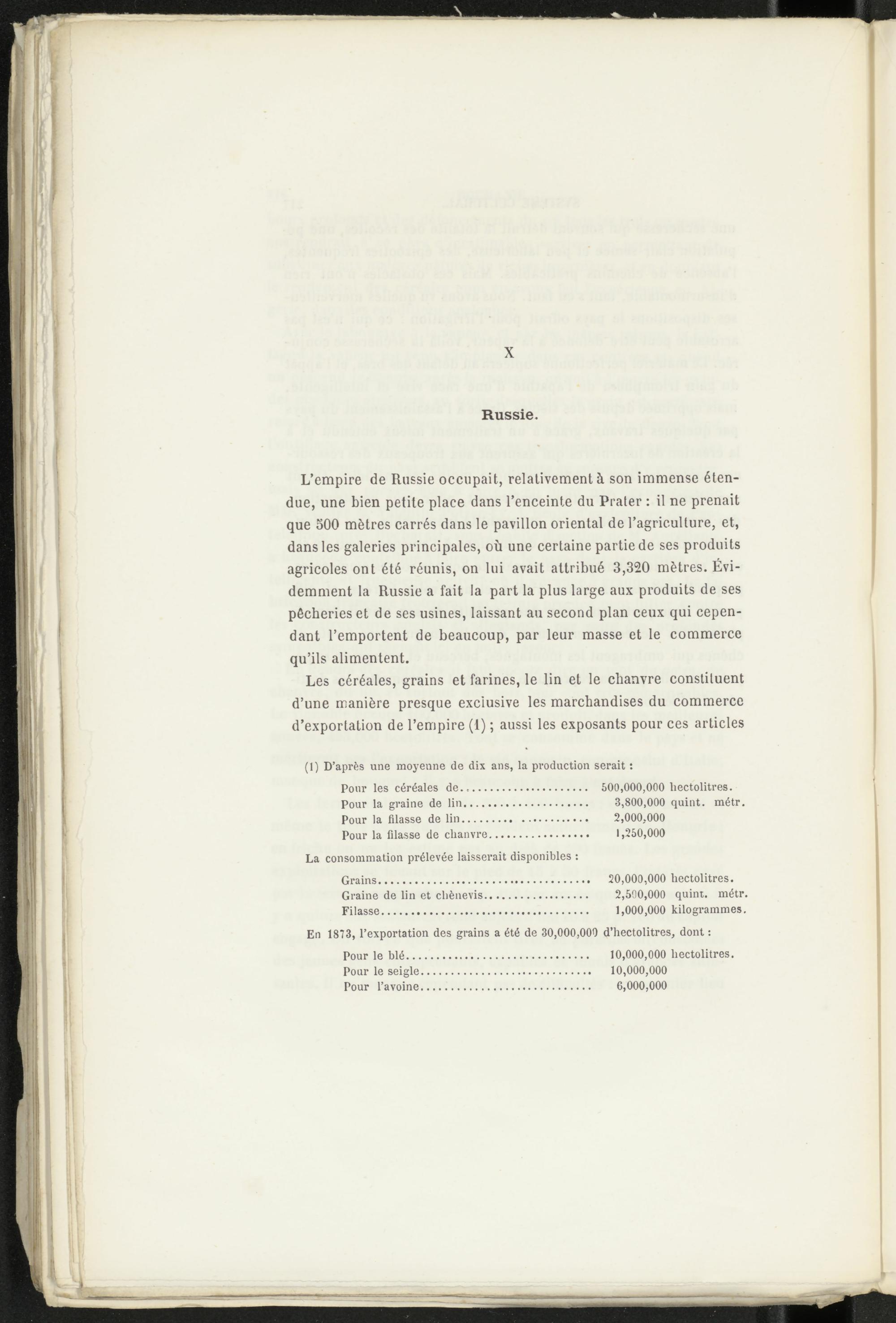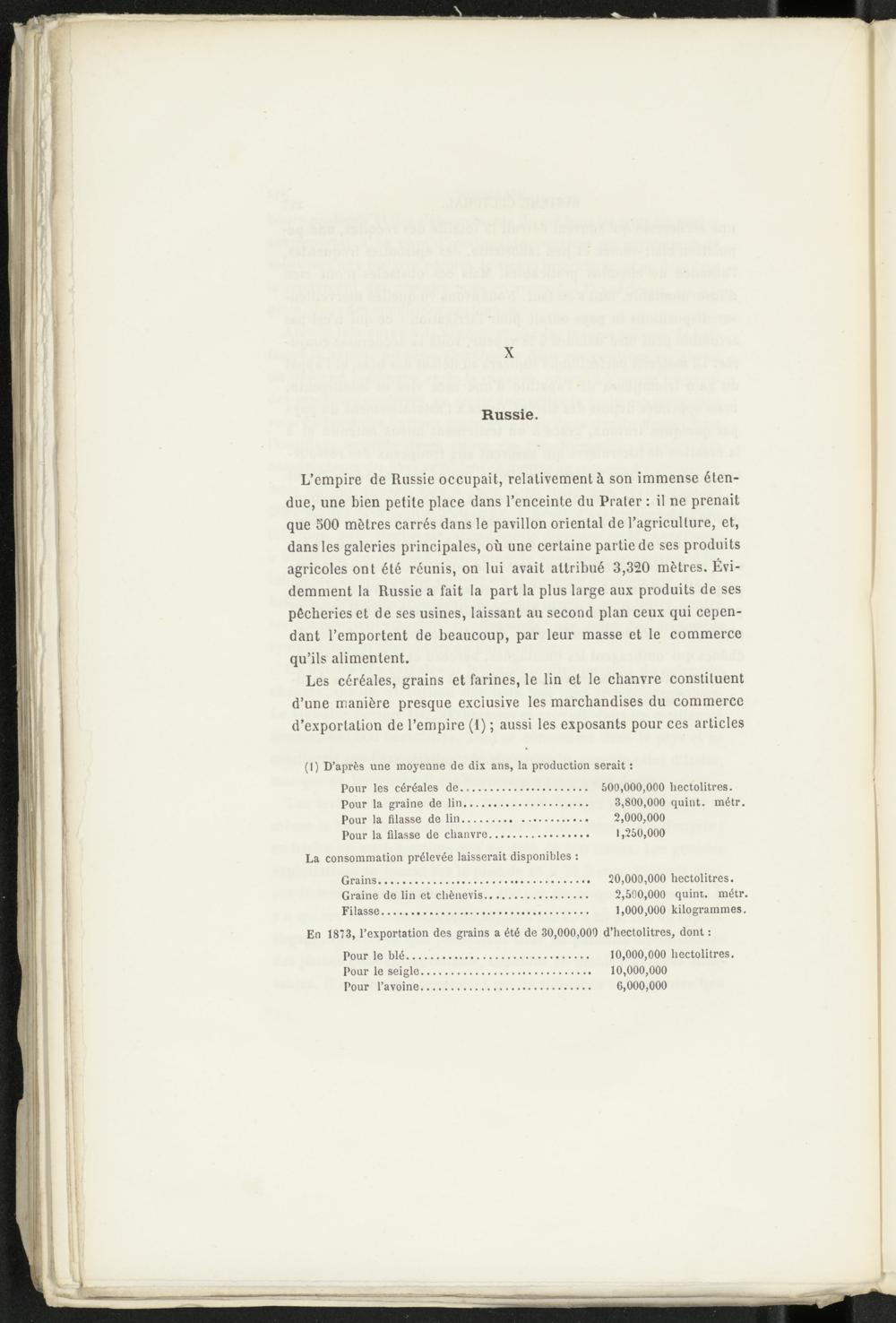 L’empire de Russie occupait, relativement à son immense étendue, une bien petite place dans l’enceinte du Prater : il ne prenait que 500 mètres carrés dans le pavillon oriental de l’agriculture, et, dans les galeries principales, où une certaine partie de ses produits agricoles ont été réunis, on lui avait attribué 3,320 mètres. Évidemment la Russie a fait la part la plus large aux produits de ses pêcheries et de ses usines, laissant au second plan ceux qui cependant l’emportent de beaucoup, par leur masse et le commerce qu’ils alimentent.