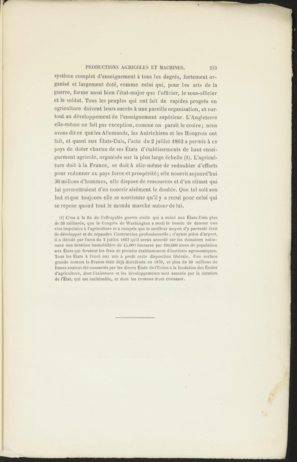 (1) C’est à la fin de l’effroyable guerre civile qui a coûté aux États-Unis plus de 30 milliards, que le Congrès de Washington a senti le besoin de donner une vive impulsion à l’agriculture et a compris que le meilleur moyen d’y parvenir était de développer et de répandre l’instruction professionnelle ; n’ayant point d’argent, il a décidé par l’acte du 2 juillet 1862 qu’il serait accordé sur les domaines nationaux une dotation immobilière de 15,000 hectares par 100,000 âmes de population aux États qui feraient les frais de premier établissement d’instituts agronomiques. Tous les États à l’envi ont mis à profit cette disposition libérale. Une surface grande comme la France était déjà distribuée en 1870, et plus de 30 millions de francs avaient été consacrés par les divers États de l’Union à la fondation des Écoles d’agriculture, dont l’existence et les développements sont assurés par la dotation de l’État, qui est inaliénable, et dont les revenus iront croissant .