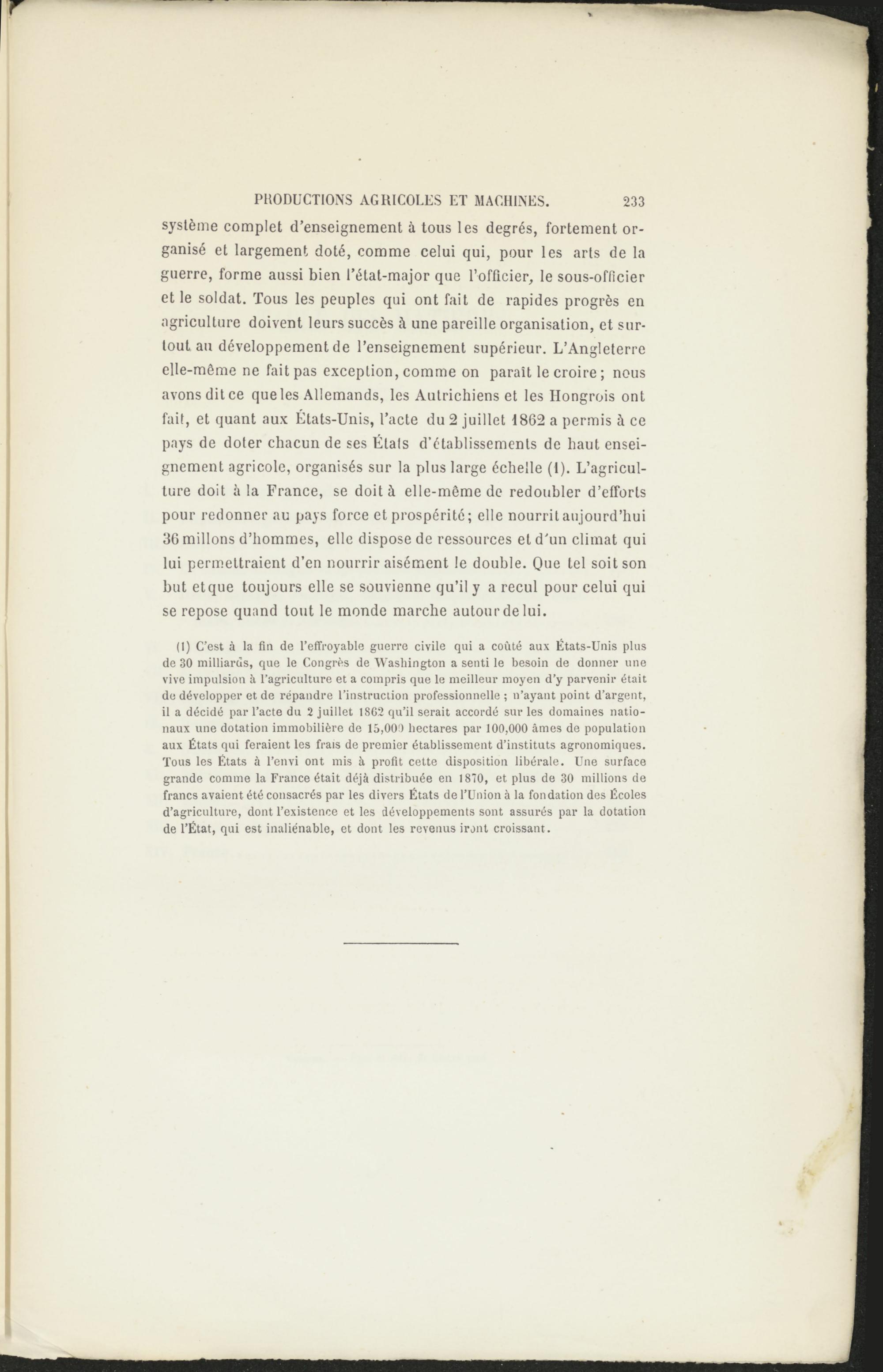 système complet d’enseignement à tous les degrés, fortement organisé et largement doté, comme celui qui, pour les arts de la guerre, forme aussi bien l’état-major que l’officier, le sous-officier et le soldat. Tous les peuples qui ont fait de rapides progrès en agriculture doivent leurs succès à une pareille organisation, et surtout au développement de l’enseignement supérieur. L’Angleterre elle-même ne fait pas exception, comme on paraît le croire ; nous avons dit ce que les Allemands, les Autrichiens et les Hongrois ont fait, et quant aux États-Unis, l’acte du 2 juillet 1862 a permis à ce pays de doter chacun de ses Étals d’établissements de haut enseignement agricole, organisés sur la plus large échelle (1). L’agriculture doit à la France, se doit à elle-même de redoubler d’efforts pour redonner au pays force et prospérité; elle nourrit aujourd’hui 36 millons d’hommes, elle dispose de ressources et d’un climat qui lui permettraient d’en nourrir aisément le double. Que tel soit son but et que toujours elle se souvienne qu’il y a recul pour celui qui se repose quand tout le monde marche autour de lui.