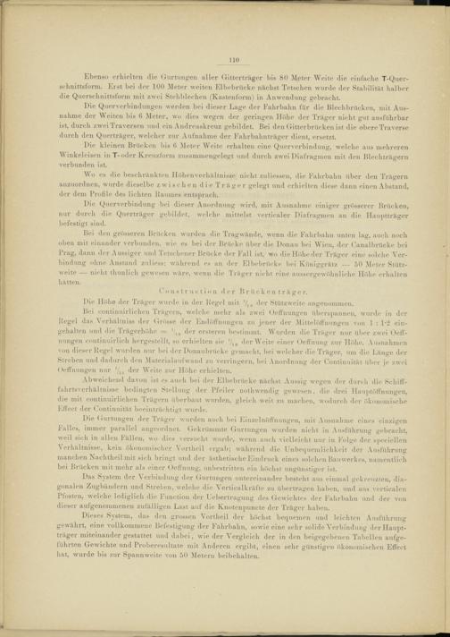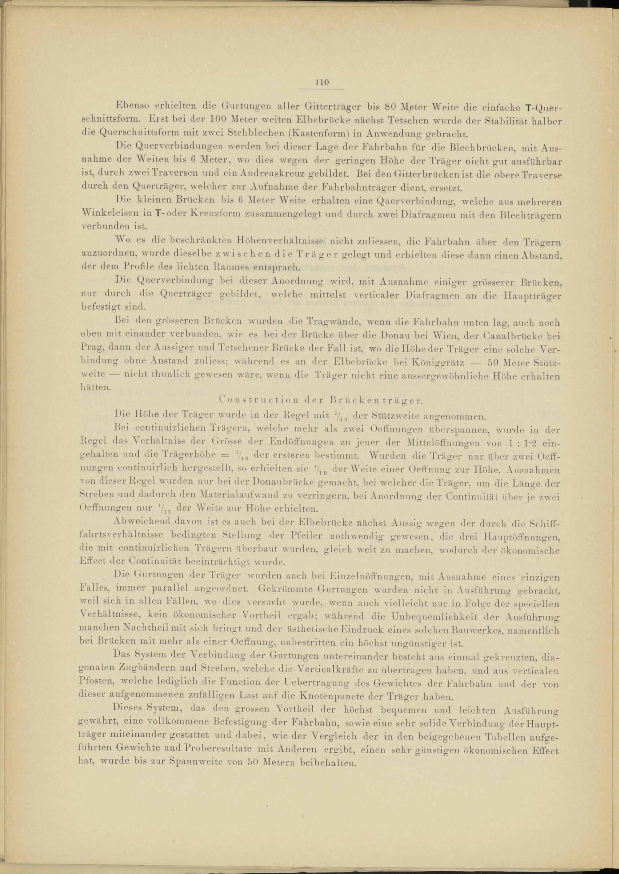 Bei den grösseren Brücken wurden die Tragwände, wenn die Fahrbahn unten lag, auch noch oben mit einander verbunden, wie es bei der Brücke über die Donau bei Wien, der Canalbrücke bei Prag, dann der Aussiger und Tetschener Brücke der Fall ist, wo die Höhe der Träger eine solche Verbindung ohne Anstand zuliess: während es an der Elbebrücke bei Königgrätz — 50 Meter Stützweite — nicht thunlich gewesen wäre, wenn die Träger nicht eine aussergewöhnliehe Höhe erhalten hätten.