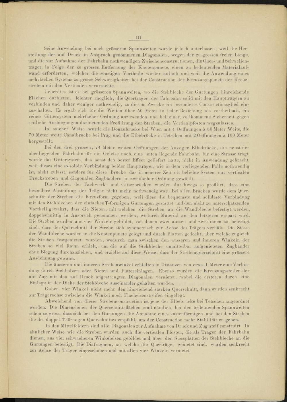 Bei den drei grossen, 74 Meter weiten Oetfnungen der Aussiger Elbebrücke, die nebst der obenliegenden Fahrbahn für ein Geleise noch eine unten liegende Fahrbahn für eine Strasse trägt, wurde das Gittersystem, das sonst den besten Effect geliefert hätte, nicht in Anwendung gebracht, weil dieses eine so solide Yerbindung beider Hauptträger, wie in dem vorliegenden Falle nothwendig ist, nicht zulässt, sondern für diese Brücke das in neuerer Zeit oft beliebte System mit verticalen Druckstreben und diagonalen Zugbändern in zweifacher Ordnung gewählt.