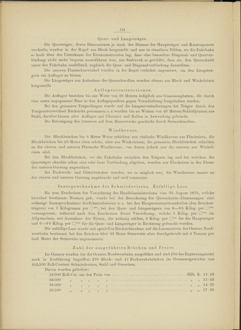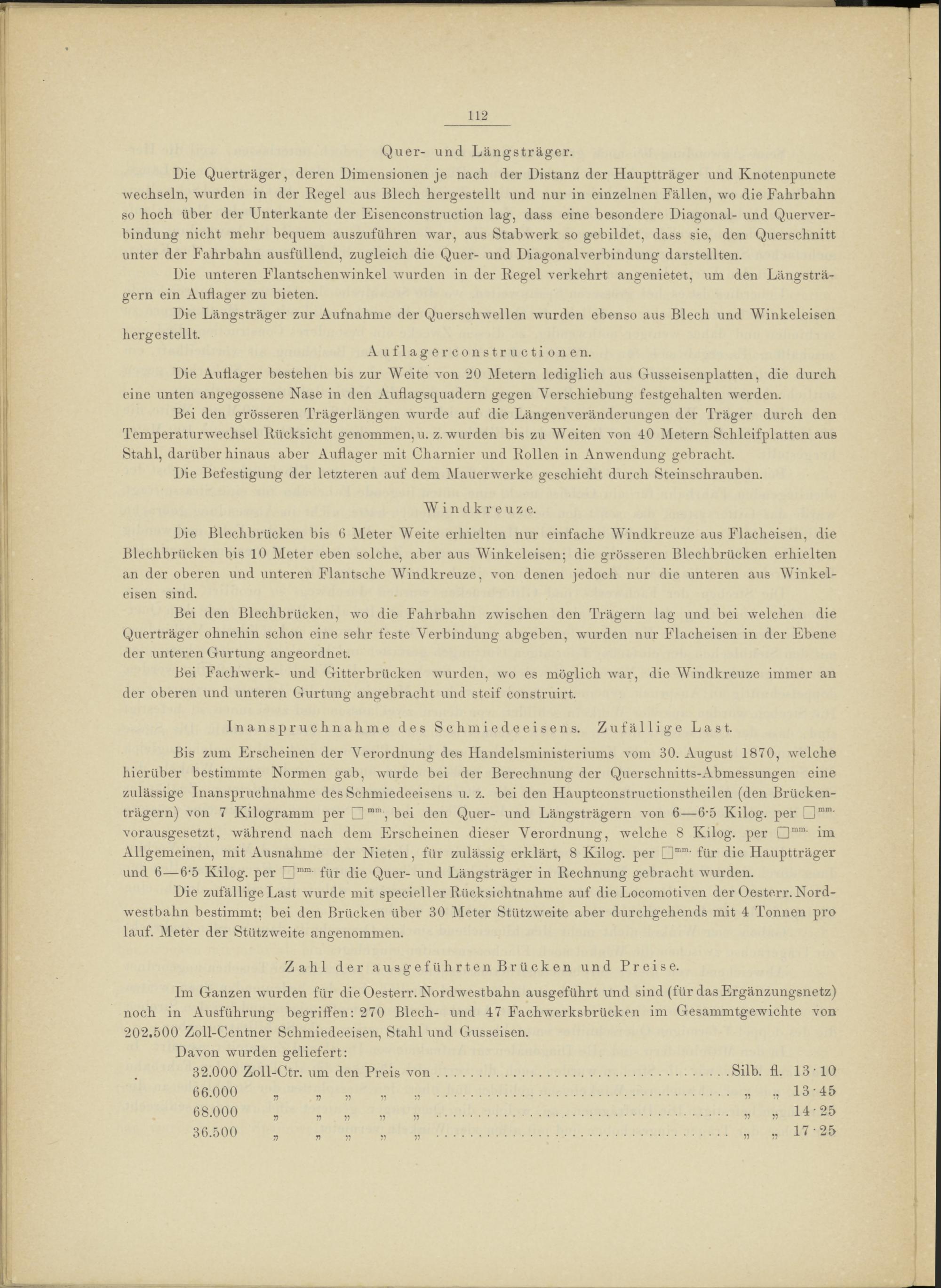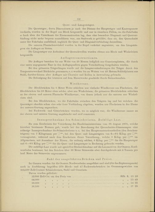 Im Ganzen wurden für die Oesterr. Nordwestbahn ausgeführt und sind (für das Ergänzungsnetz) noch in Ausführung begriffen: 270 Blech- und 47 Fachwerksbrücken im Gesammtgewichte von 202.500 Zoll-Centner Schmiedeeisen, Stahl und Gusseisen.