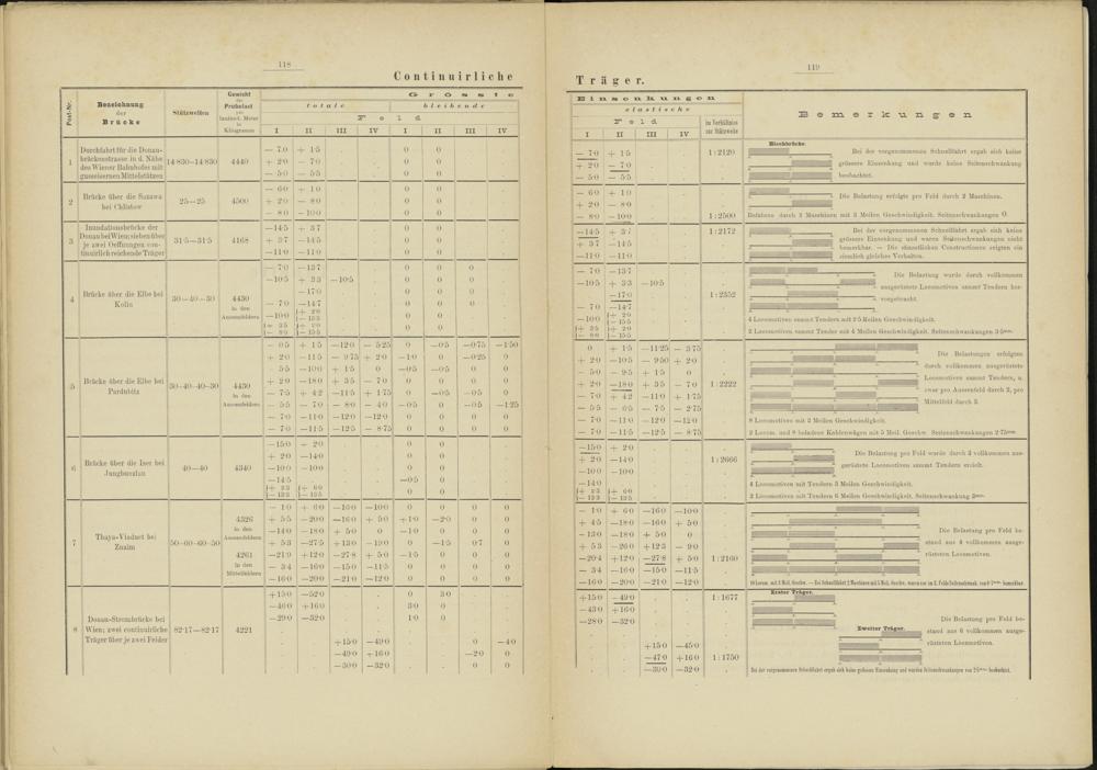 | Inundationsbrücke der Donau bei Wien; sieben über ; je zwei Oeffnungen con- ; tinuirlicli reichende Träger
