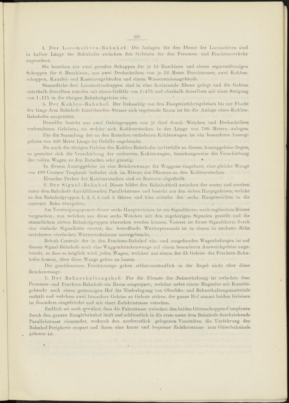 5. Der K o h 1 e n - B a h n h o f. Der linksseitig von den Haupteinfahrtsgeleisen bis zur Flucht der längs dem Bahnhofe hinziehenden Strasse sich ergebende Kaum ist für die Anlage eines Kohlen- Bahnhofes aus genützt.