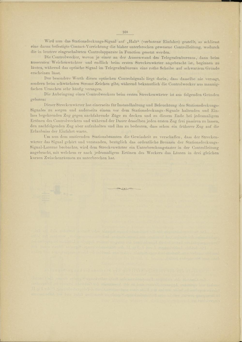 Die Controlwecker, wovon je einer an der Aussenwand des Telegrafen bureaus, dann beim äussersten Weichenwächter und endlich beim ersten Streckenwärter angebracht ist, beginnen zu läuten, während das optische Signal im Telegrafenbureau eine rotlie Scheibe auf schwarzem Grunde erscheinen lässt.