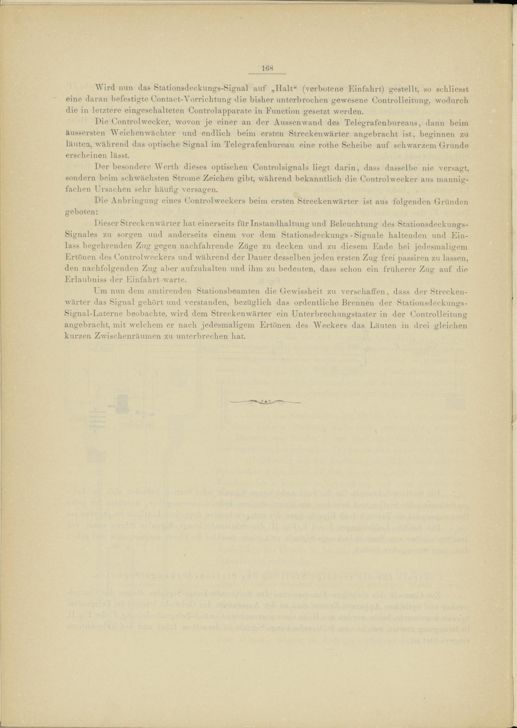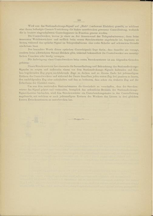 Dieser Streckenwärter hat einerseits für Instandhaltung und Beleuchtung des Stationsdeckungs- Signales zu sorgen und anderseits einem vor dem Stationsdeckungs - Signale haltenden und Einlass begehrenden Zug gegen nachfahrende Züge zu decken und zu diesem Ende bei jedesmaligem Ertönen des Controlweckers und während der Dauer desselben jeden ersten Zug frei passiren zu lassen, den nachfolgenden Zug aber aufzuhalten und ihm zu bedeuten, dass schon ein früherer Zug auf die Erlaubniss der Einfahrt warte.