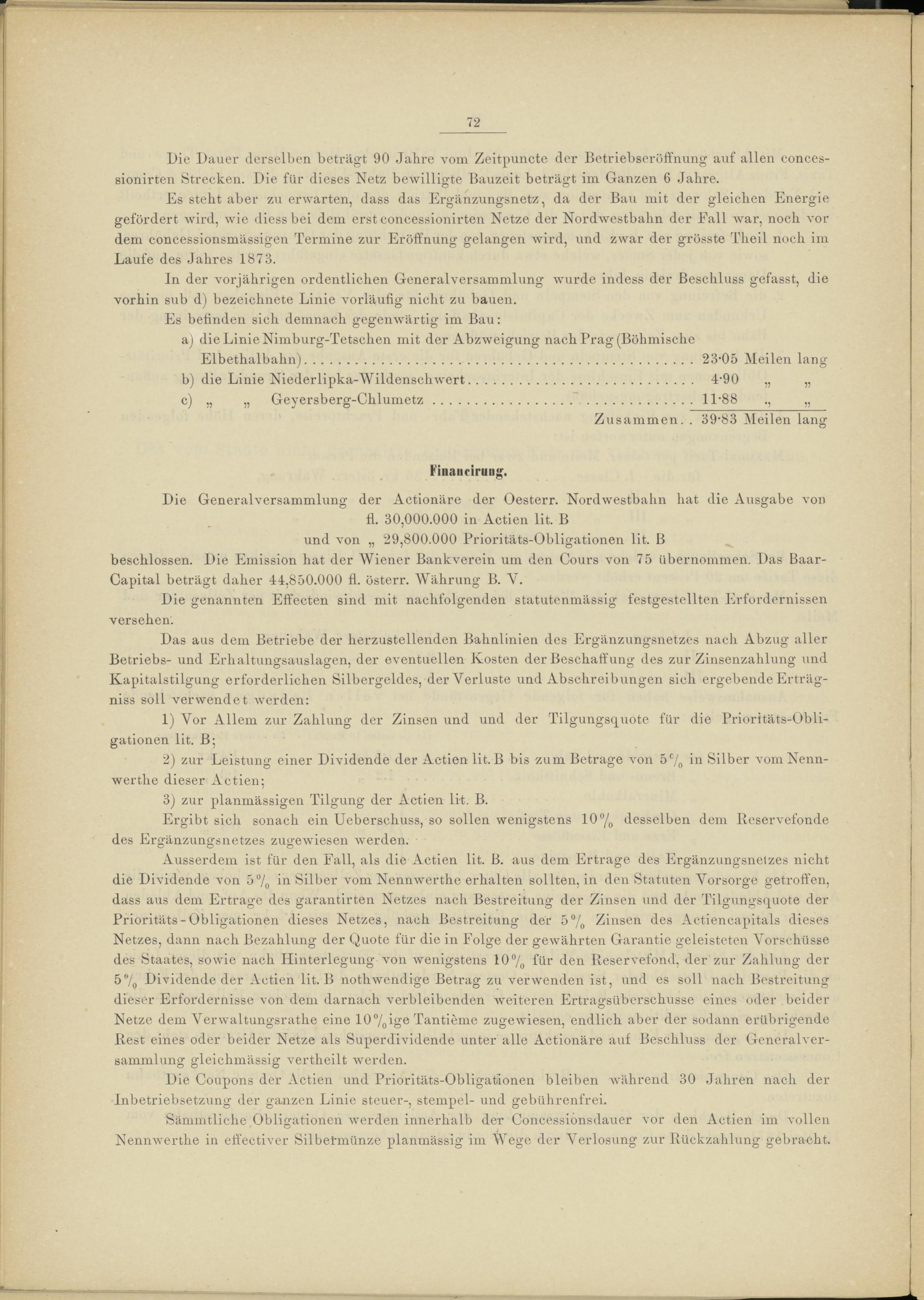 fl. 30,000.000 in Actien lit. B und von „ 29,800.000 Prioritäts-Obligationen lit. B beschlossen. Die Emission hat der Wiener Bankverein um den Cours von 75 übernommen. Das Baar- Capital beträgt daher 44,850.000 fl. österr. Währung B. Y.