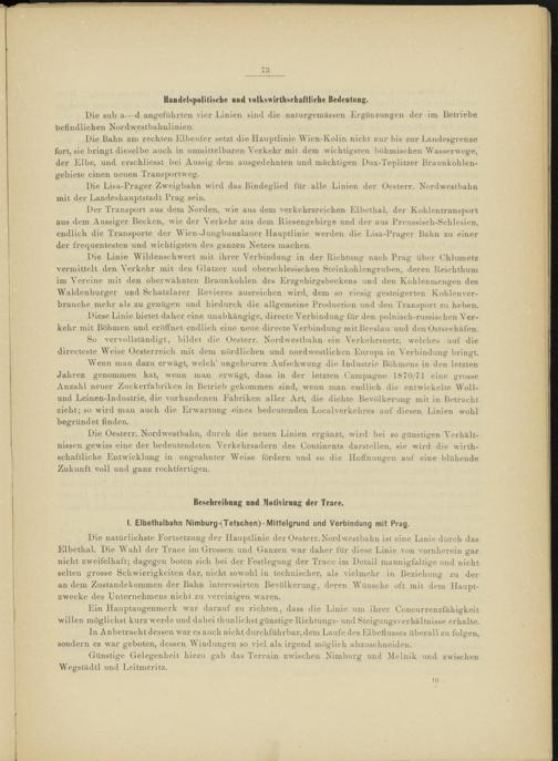 Wenn man dazu erwägt, welch’ ungeheuren Aufschwung die Industrie Böhmens in den letzten Jahren genommen hat, wenn man erwägt, dass in der letzten Campagne 1870/71 eine grosse Anzahl neuer Zuckerfabriken in Betrieb gekommen sind, wenn man endlich die entwickelte Woll- und Leinen-Industrie, die vorhandenen Fabriken aller Art, die dichte Bevölkerung mit in Betracht zieht; so wird man auch die Erwartung eines bedeutenden Localverkehres auf diesen Linien wohl begründet finden.
